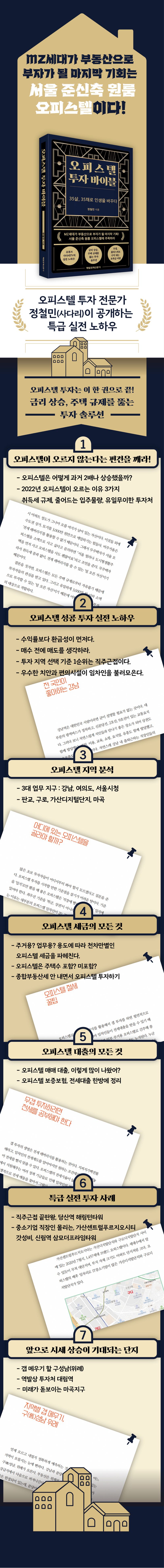 크게 3가지의 주제를 담고 있는 이 책은 첫 번째로는 ‘오피스텔은 절대 오르지 않는다’라는 편견에 도전한다. 과거의 오피스텔은 2배나 매매가가 상승했고, 지금은 그때와 상황이 다르지 않다는 것을 이야기하고 있다. 오피스텔 매수는 초보 부동산 투자자에게는 쉽지 않은 도전이지만, 성공률이 높은 도전이라는 것을 확실한 근거와 논리로 설명한다. 두 번째 주제는 ‘오피스텔 투자 실전 솔루션’이다. 오피스텔은 아무 데다 투자하면 안 되는 상품이므로 어떤 지역에서 어떤 것을 사야 하는지 세세하게 설명했다. 세 번째는 ‘오피스텔 세금’ 관련 내용이다. 오피스텔은 주거용, 업무용 등 용도에 따라서 내는 세금이 천차만별이므로, 여러 경우의 수를 고려해 절세할 수 있는 방법을 자세하게 다뤘다. 부동산 투자하기 어려운 시장 상황과 적은 투자금에도 불구하고 부동산 투자가 정답이라고 생각한다면, 이 책으로 오피스텔 투자를 시작해보자.