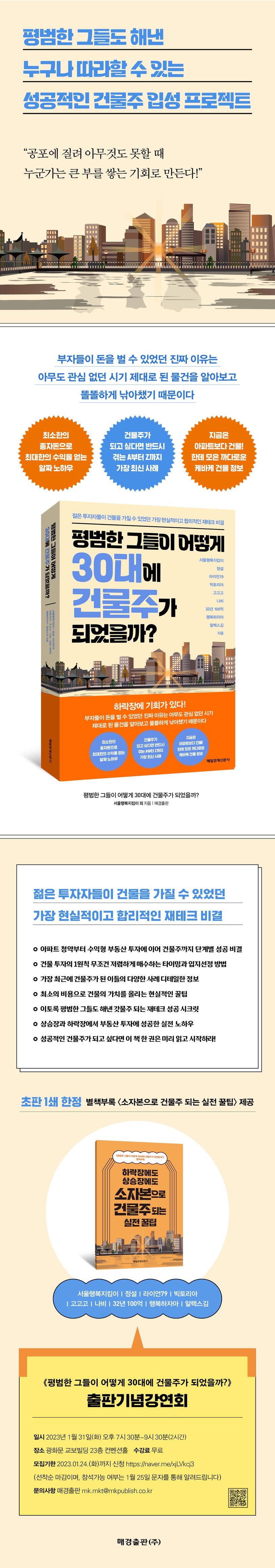 투자 없이 부를 축적하는 데는 한계가 있다. 타이밍을 잡기 위해 지금부터 공부가 필요하다. 건물은 토지의 가치 상승과 상가의 월세 수입을 동시에 얻을 수 있는 좋은 투자 상품이다. 안정성을 중시할 수밖에 없는 지금 같은 시기에 아파트 투자보다 건물 투자다. 저자들은 당신과 크게 다르지 않은 평범한 직장인이자 가정주부, 자영업자다. 이토록 평범한 저자들이 30대에 건물주가 될 수 있었던 비결은 무엇일까? 크지 않은 종자돈으로 투자로 성공하여 눈에 띄는 결과물을 만든 그들이 시행착오를 겪으며 고생스럽게 체득한 부동산 재테크의 최신 정보를 이 한 권의 책에 가감 없이 담아냈다. 건물 투자에서 실제로 맞닥뜨리는 다양한 사례를 통해 건물주가 되고자 하는 사람이라면 반드시 겪을 수밖에 없는 A부터 Z까지 단계별 노하우를 일러준다. 한 발짝 먼저 건물 투자에 눈 뜬 저자들의 행보를 무작정 따라해보는 순간 부동산 초보자들도 어느새 건물주의 대열에 들어설 수 있을 것이다.