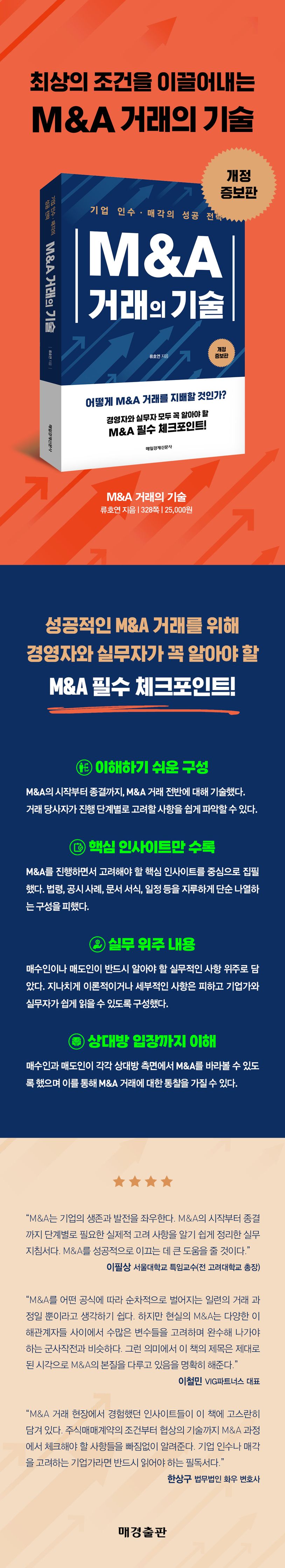 M&A를 하고자 하는 매수인이나 매도인은 최소한 거래가 어떻게 진행되고 절차마다 어떤 점을 고려해야 하는지에 대한 지식이 있어야 한다. 그래야 M&A의 시작부터 종결까지 모든 과정을 지배하고 리드할 수 있으며 시행착오 역시 최소화할 수 있다. 비록 M&A는 거래마다 이슈도 다르고 진행 절차도 다르기 때문에 한두 번의 경험으로는 통찰을 얻기 어려운 분야이지만, 이 책을 통해 M&A 거래 전체를 보는 시각과 통찰을 얻을 수 있을 것이다.