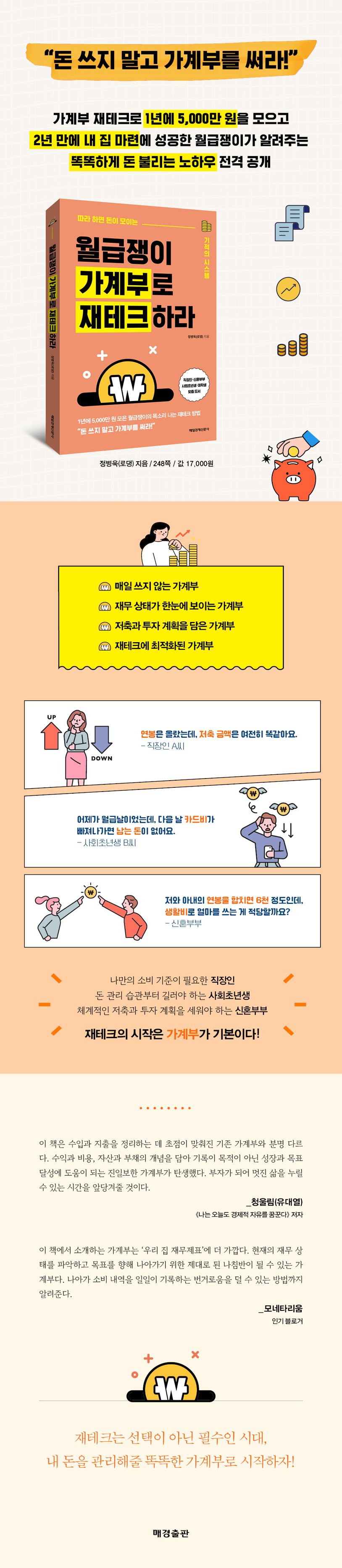 가계부를 열심히 쓰면 돈을 벌 수 있다는 말은 거짓말이다. 오히려 가계부를 뚫어지게 쳐다보는 시간이 길어야 자산을 체계적으로 관리할 수 있다. 이 책은 수입과 지출 내역을 정리하는 가계부 양식 책이 아니다. 가계부를 통해 재무 상태를 파악하고, 목표를 세우고, 투자와 연결하는 방법을 알려주는 재테크 책이다. 저자는 가계부로 재테크를 시작해 2년 만에 내 집 마련에 성공했다. 책에서 알려주는 대로 딱 1년만 따라 해보면 어느새 경제적 자유를 향해 성큼 다가서 있을 것이다.