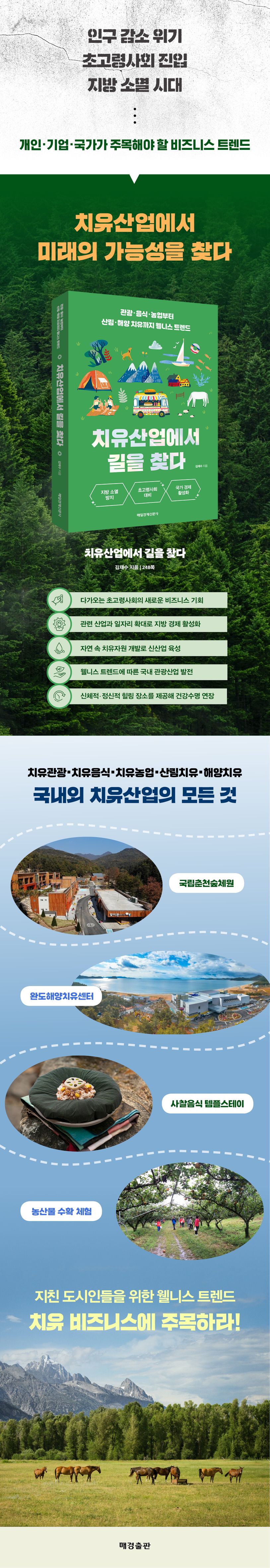 인구 감소, 초고령사회 진입, 농촌 경제 침체 등 한국 사회에 지속적으로 대두되는 문제들이 있다. 저자는 이러한 사회 문제들에 대비하기 위한 여러 해결책 중 치유산업을 강조한다. 인구구조의 변화가 산업 지형을 송두리째 바꾸고 있는 상황에서 치유산업은 앞으로 전 세계적으로 꾸준한 성장을 이어갈 전망이다. 이에 발맞춰 국내 치유산업 현황을 파악하고 선진국의 치유산업 트렌드를 통해 앞으로 주목할 만한 신산업 분야를 살펴보고자 한다.