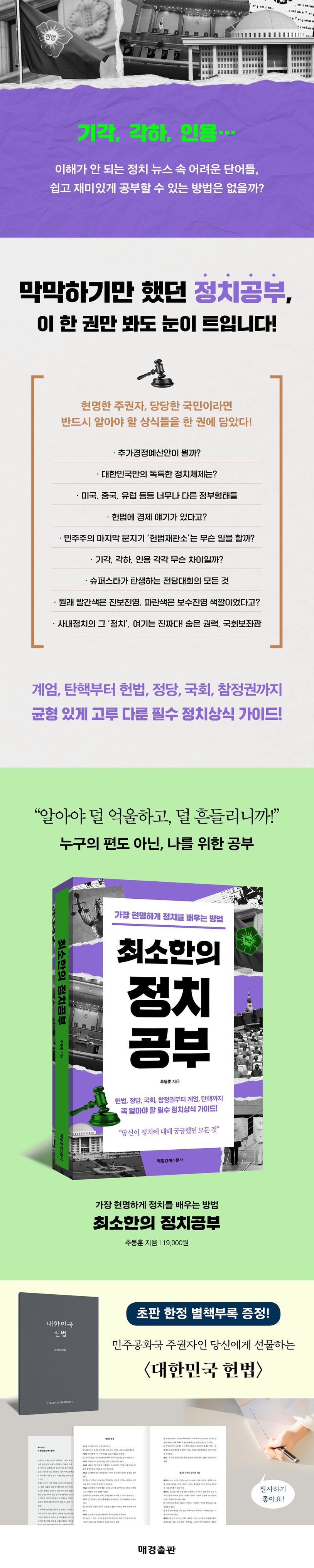 《최소한의 정치공부》는 국회에 다년간 출입했던 정치부 기자 출신 추동훈 저자가 생동감 넘치는 정치를 쉽고 재미있게 담아낸 책이다. 바쁜 삶 한가운데, 나의 권리를 지켜내기 위해서 꼭 알아야 할 정치상식을 엄선해 모두 담았다. 초판 한정 별책부록으로 대한민국을 꾸리는 기본 원리, 《대한민국 헌법》도 함께 증정한다.
