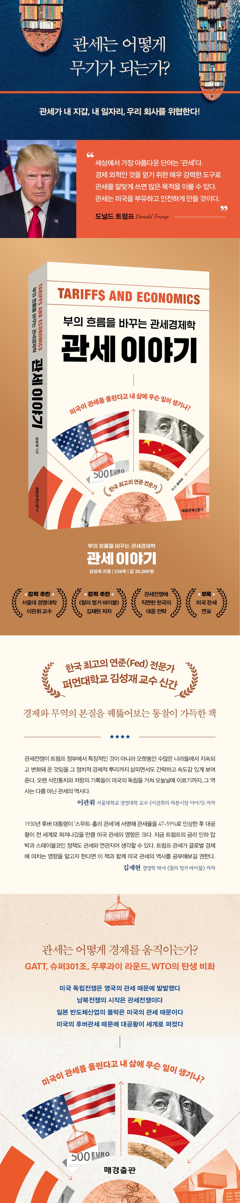 관세는 국내 산업 보호 기능을 하지만, 가격 왜곡, 무역 효율성 감소, 물가 상승, 소비자 이익 감소 등을 통해 경제 전체에 부정적 영향도 적지 않다. 저자는 미국과 영국이 시행했던 관세 정책의 역사적 사례와 수요와 공급의 원리, 금리와 통화량에 따른 금융시장의 변화 등을 설명하고 데이비드 리카도와 존 스튜어트 밀 등의 경제 이론을 바탕으로 자유무역이 경제 성장과 안정에 더 효과적임을 강조하며 바람직한 경제정책의 방향성을 제시한다. 또한 관세전쟁으로 시작된 복잡하고 긴급한 경제 위기 상황에서 우리나라 경제가 대비하고 돌파할 수 있는 전략을 조언한다.