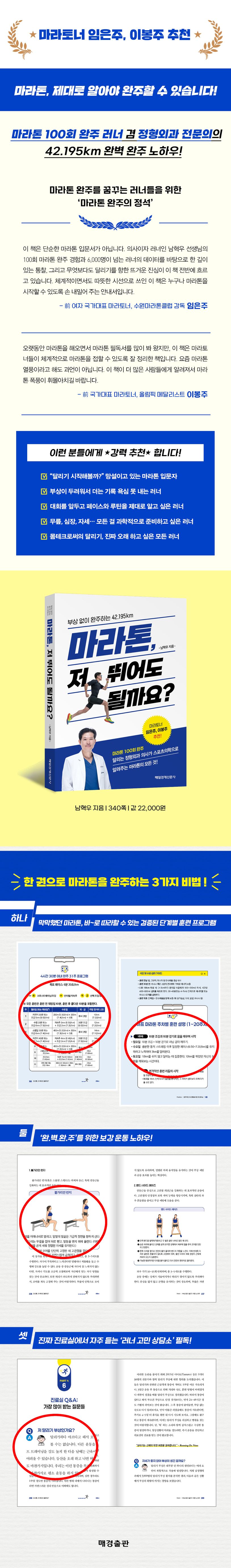 《마라톤,저뛰어도될까요?》는정형외과전문의이자마라톤100회를완주한저자의의학적통찰과실제러닝경험을바탕으로마라톤을위해준비해야할거의모든것을제시하는책이다.이책은수많은부상러너를진료한임상데이터를분석해마라톤을시작하기전점검해야할건강체크리스트,근력과유연성테스트,부상위험이큰부위와예방법등을구체적으로알려준다.
