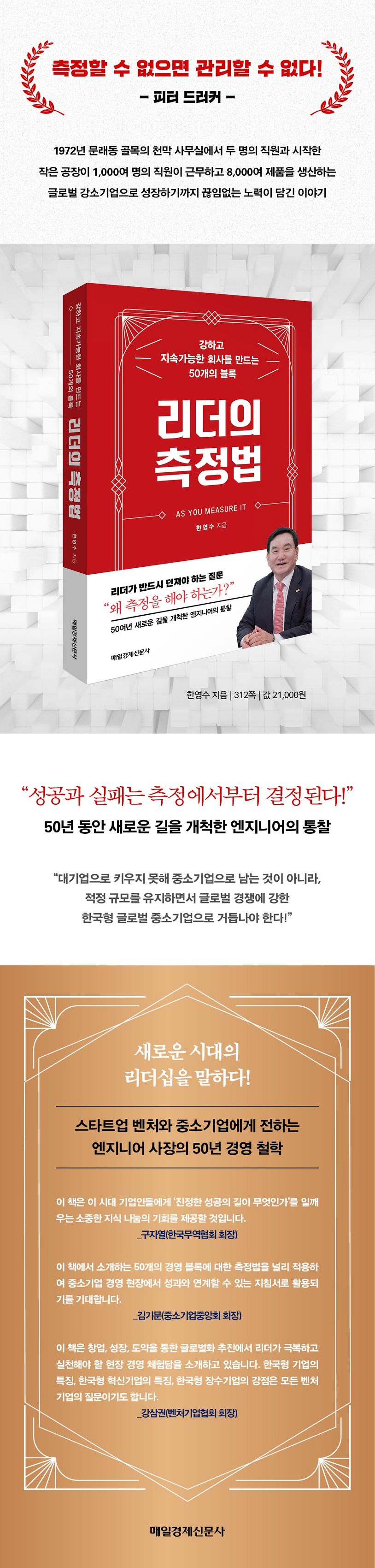 한영수회장이강조하는기업경영의다섯가지큰주제인창업,생존,품질우선,고객중시,글로벌경영을비롯해세부주제인도전,열정,생존,직원,품질,파트너십,글로벌사업,정부정책,현장,책임이라는키워드를주제로효과적인기업경영을위한질문과한국형혁신기업,한국형장수기업의미래에대한비전을제시한다.또한한회장은“대기업으로키우지못해중소기업으로남는것이아니라,적정규모를유지하면서글로벌경쟁에강한한국형글로벌중소기업”으로거듭나야하는중요성을강조한다.성장의시대와다양성의시대,소공인들의진원지인문래동의작은전자부품회사가50년간장수할수있었던이유,오늘날대한민국의비즈니스현장의현실을냉철하게진단하는선배기업인의관점을전한다.