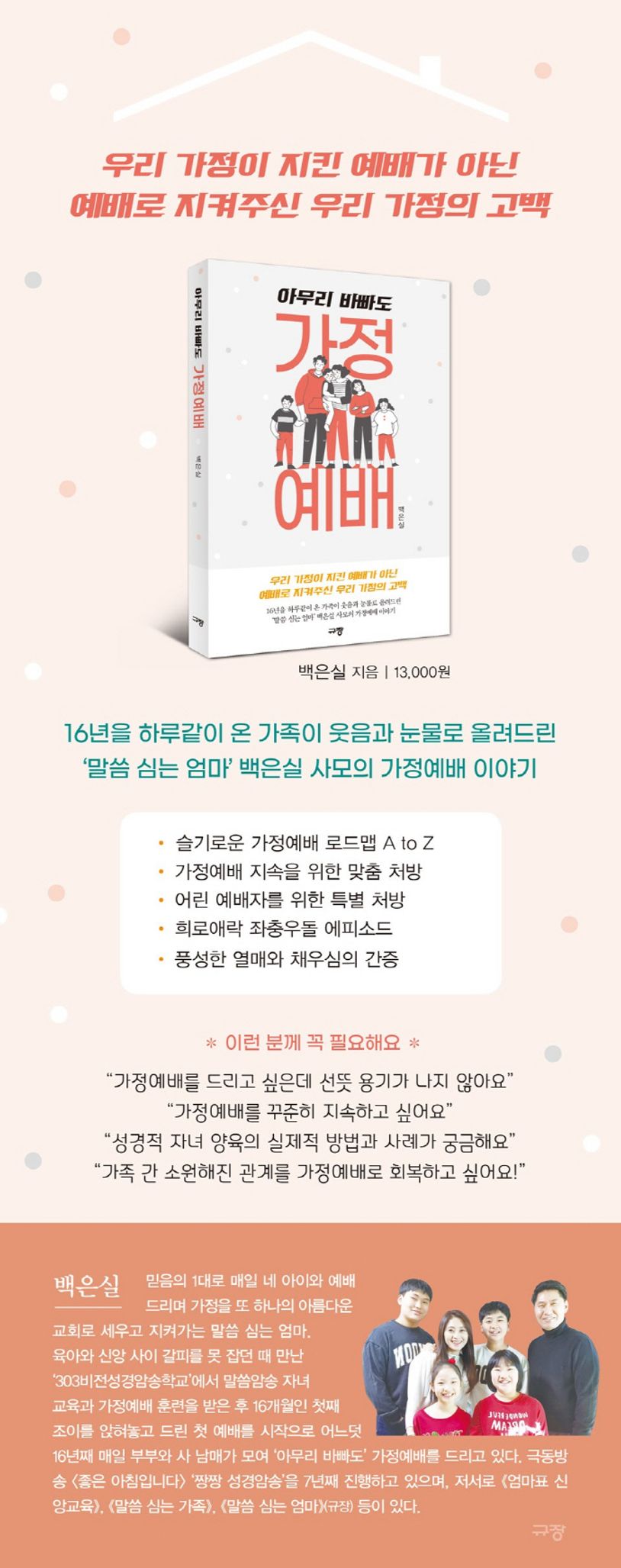 가정예배를 드리고 싶은데 선뜻 용기가 나지 않는 분, 가정예배를 꾸준히 지속하고 싶은 분, 성경적 자녀 양육의 실제적 방법과 사례가 궁금한 분, 가족 간 소원해진 관계를 가정예배로 회복하고 싶은 분에게 도움이 될 것입니다.