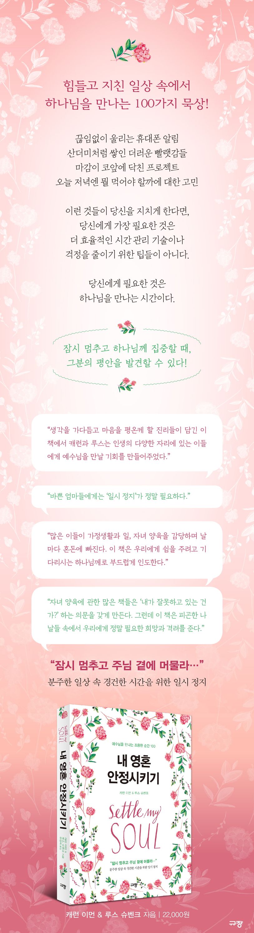반복되는일상에지쳤다면,잠시멈추고영적인숨을쉬라!아침에눈을뜨면서만나는‘해야할일들’.그일들을따라가다보면어느새하루가끝이난다.이책을쓴캐런이먼과루스슈벤크도정말바쁜삶을살고있다.많은사람을만나고,책을쓰고,아이들을양육한다.그러나그일들에압사당하지않고,오히려감사를찾으며살아간다.그들은그렇게살수있는비결을책을통해말해준다.바로,영적인숨을쉬기위한순간을가져야한다는것이다.캐런과루스는우리의삶에서‘일시정지’버튼을눌러야할때가있다고말한다.하나님을만나는시간,이웃을돌아볼시간,무엇보다나를돌아볼시간을확보하기위해,영적인숨을쉬는순간이있어야한다고말한다.그녀들은삶의소소한일상속에서그순간을확보할수있도록우리에게도움을주고싶어한다.그녀들이나누는삶과질문들을통해그순간을확보해보자.삶의작은일들을바라보는새로운관점을배워보자.이책의글들은매우짧다.짧은순간을투자해영혼의유익을얻어보라.서문중에서인생에어떤일이닥쳐도예수님으로인해우리의영혼이평안을누리는방법.눈딱감고‘일시정지’버튼을눌러라!?혹당신의하루가수많은의무와해야할일의끝없는목록으로꽉꽉채워져있는가?만약그렇다면여기서부터시작해보라.?휴대폰알림을모두끄라.더러운빨랫감을조금만더못본척하라.마감이코앞에닥친프로젝트생각을멈추라.오늘저녁에뭘먹어야할까에대한고민을그만두라.?당신이직장인이거나,전업주부거나,부모거나,자녀거나,학생이거나,어디에속하든간에,지금당신의힘들고지친마음에가장필요한것은‘쉼’이다.우리에게는시간을잘관리하는법이아니라우리의생각을하나님과그분의말씀에집중하며하나님을만나는시간이필요하다.매일몇분동안만이라도삶의일시정지버튼을누른다면,예수님이당신에게주고자하시는것을발견할것이다.바로그분의평안이다.