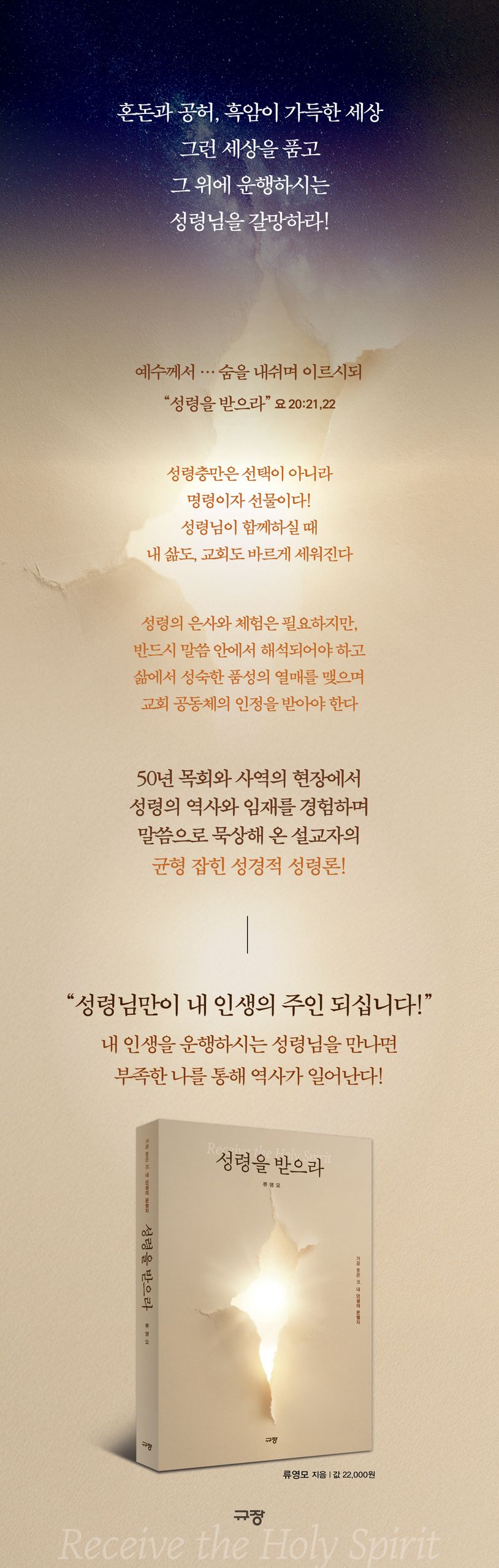 교육전도사로 교회를 섬기기 시작한 지 꼭 50년 되는 해에 은퇴하며, 50번째 책으로 오랫동안 가장 깊이 다루고 싶었던 주제인 성령론을 집필하게 되었다. 전도의 현장에서 성령의 임재를 경험할 때마다 성경적, 신학적으로 점검하고 묵상해야 할 필요를 느꼈고, 그 결과 자연스럽게 성령론에 관심을 갖게 되었는데 이러한 50년의 목회 여정이 이 한 권의 책, 《성령을 받으라》로 결실을 맺게 되었다.