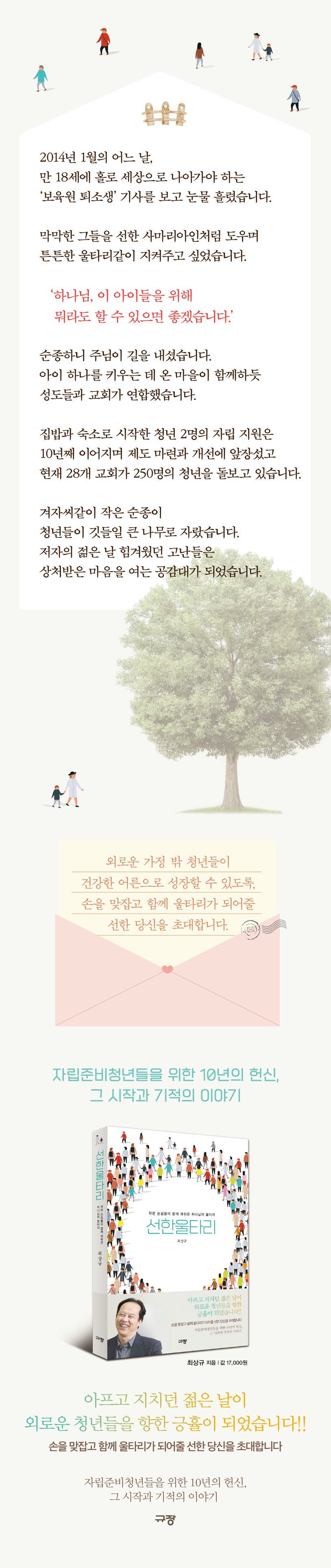 선한 사마리아인처럼 “네 이웃을 네 몸과 같이 사랑하라”라는 말씀을 삶으로 실천하며 하나님나라의 울타리를 함께 세워가고 싶은 분, 자립준비청년들을 돕고 싶은데 방법을 몰랐던 분, 이해할 수 없는 인생의 고난 속에서 하나님의 뜻을 구하는 모든 분에게 간곡히 추천한다.