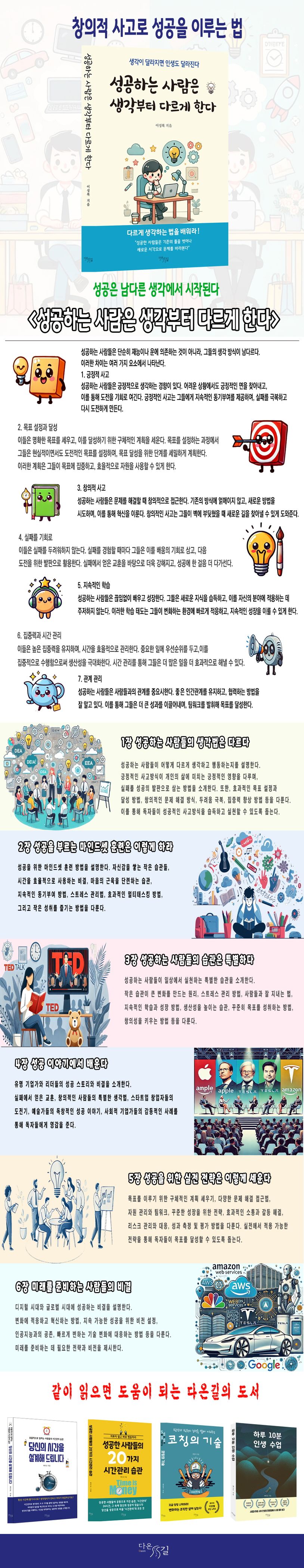 이러한 작은 변화들이 모여 내 인생을 크게 바꾸어 놓았다. 긍정적인 생각이 일상에서 큰 영향을 미칠 수 있다는 것을 깨달았다. 이 책에서는 생각하는 힘이 우리의 삶을 어떻게 바꿀 수 있는지에 대해 이야기하며, 작은 변화부터 시작해보자고 제안한다. 긍정적인 생각이 우리의 미래를 만든다는 믿음을 바탕으로 함께 변화를 시작해보자.
