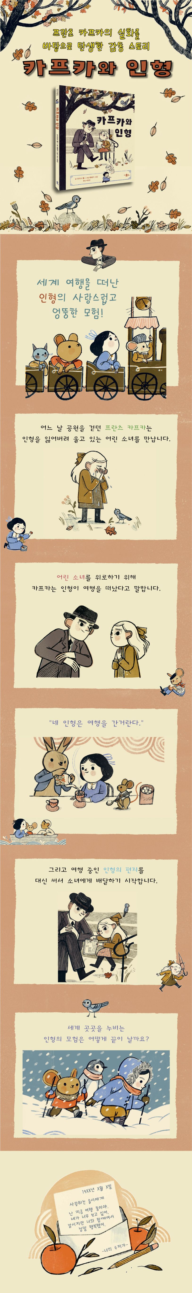 어느 날 공원을 산책하던 프란츠 카프카는 인형을 잃어버려 울고 있는 어린 소녀를 만납니다. 어린 소녀를 위로하기 위해 카프카는 인형이 여행을 떠났다고 말합니다. 그리고 여행 중인 인형의 편지를 대신 써서 소녀에게 배달하기 시작합니다. 세계 곳곳을 누비는 인형의 모험은 어떻게 끝이 날까요?