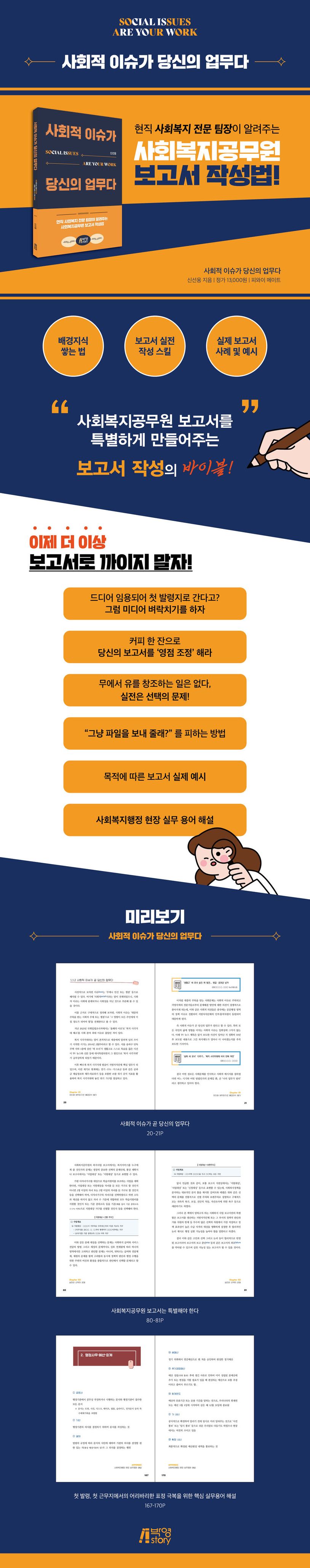 이 책은 장기적으로 이러한 환경변화에 적응하여 사회복지 공무원의 역량 강화를 기대하고자 사회복지 공무원의 사업계획 또는 업무추진 등과 같은 일련의 보고서 작성 방법을 저자의 경험에 비추어 정리하였으며, 각별히 사회복지 공무원으로 첫 임용을 목전에 두고 있는 사회복지 공무원 후배들에게 첫 발령지에서의 어려움에 작으나마 유의미한 도움이 되길 바라는 마음에서 사례를 많이 소개하고자 노력하였다.