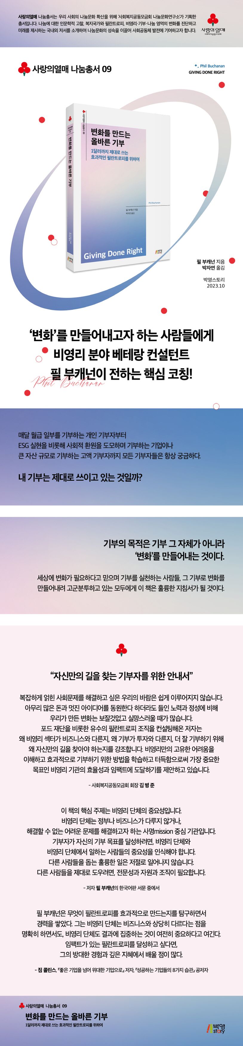 기부의 목적은 기부 그 자체가 아니라 ‘변화’를 만들어내는 것이다. 세상에 변화가 필요하다고 믿으며 기부를 실천하는 사람들, 그 기부로 변화를 만들어내려 고군분투하고 있는 모두에게 이 책은 훌륭한 지침서가 될 것이다.