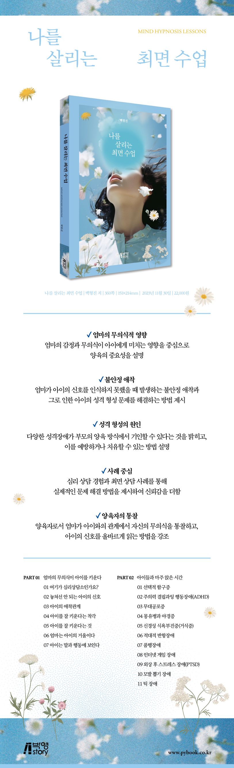 마지막으로 이 책에 실린 모든 이야기는 엄마와 아이들과의 최면 상담을 하면서부터 시작된다. 이 모든 이야기는 그들이 없었다면 감히 엄두도 못 낼 일들이다. ‘타인의 가슴앓이를 덜어주고 멈출 수 있다면 헛된 삶을 산 것은 아니다’라는 의미를 지닌 에밀리 디킨슨의 글처럼 양육자의 사랑을 제대로 받지 못해서 병들어 가고 있는 아이들이 아직도 우리 곁에 많이 있다면 그들의 아픔과 고통을 같이 나누고 떨쳐낼 수 있도록 다가가 보려고 하며, 앞으로도 좋은 기회가 주어진다면 더 많은 사람을 만나고 그들로부터 얻은 좋은 정보와 사례를 통해서 이 넓은 세상의 빛이 되도록 나름대로 힘을 쏟아내고 싶다.