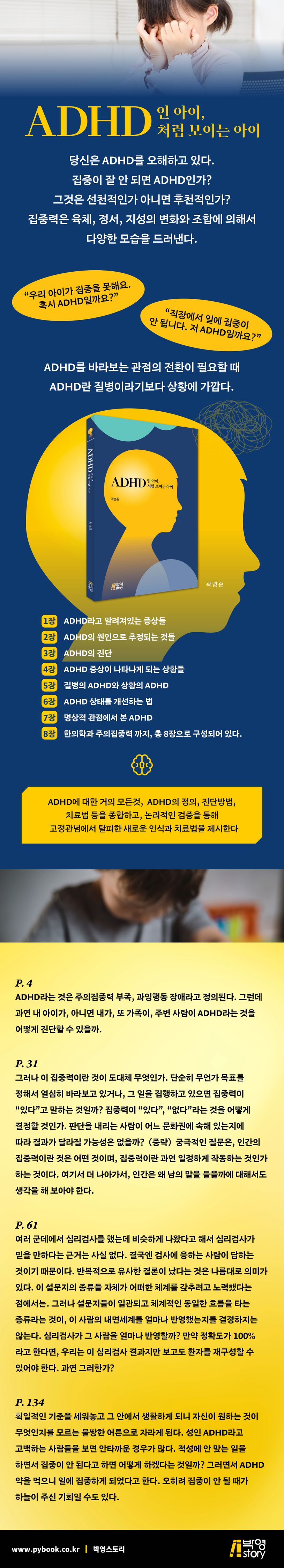 ADHD란 도대체 무엇을 말하는 것일까? 집중이 잘 안 되면 ADHD일까? 그러면 집중이 잘 되다가, 어느 시점부터 안 되기 시작하면 ADHD가 발병한 것인가? 자기가 좋아하는 일에는 집중이 잘되지만 싫어하는 일에는 집중을 못한다면 그 경우도 ADHD인가? 그리고 우리가 ADHD라는 문제를 인식하고, 병명을 붙이고, 해결을 위해 노력하는 것은 무엇을 위함인가? 그 노력의 최종 목표는 무엇인가? 이러한 질문을 던지고 대답하는 책이다.