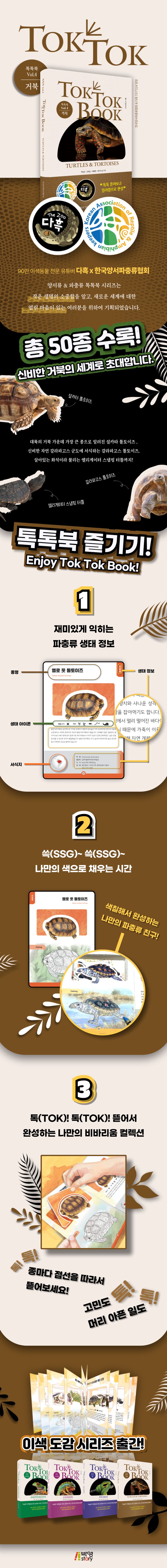 [양서류 & 파충류 톡톡북] 시리즈는 작은 생명의 소중함을 알고, 새로운 세계에 대한 열린 마음이 있는 여러분을 위하여 기획되었다. 거북(TURTLES&TORTOISES) 편에서는 대표 거북 50종의 매력적인 사진과 유익한 정보가 담겨 있다. 거북의 모양을 따라 종이를 톡톡! 뜯어내고, 사진을 보며 쓱쓱~ 컬러링하면 나만의 독특한 비바리움(Vivarium) 컬렉션이 완성된다. 낯설지만 우리 곁에 함께 함께해온 존재들, 그 친구들의 매력을 톡톡북(TOK TOK BOOK)에서 찾아보자.