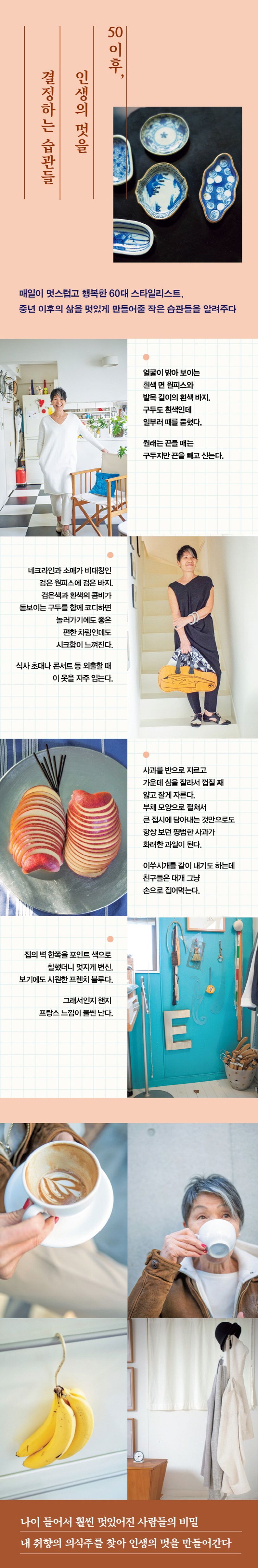50이 지나면 나만의 멋을 찾기 시작해야 한다. 내가 입는 옷, 내가 먹는 음식, 내 생각과 말투 등 사소한 내 취향들을 파악하고 활용할 줄 알아야 한다. 《50 이후, 인생의 멋을 결정하는 습관들》은 매일이 멋스럽고 행복한 60대 스타일리스트의 평소 습관을 담았다. 중년 이후의 삶을 멋있게 만들어줄 작은 습관들을 알려주는 책이다.