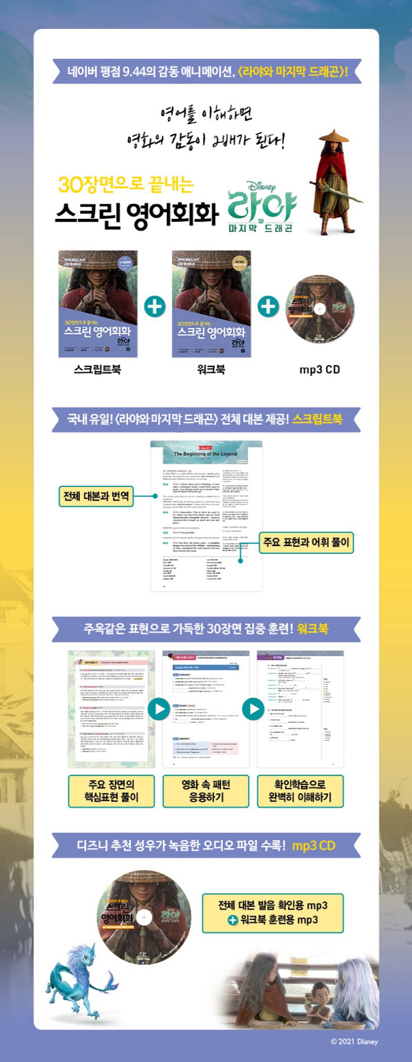 영어 고수들은 입을 모아 영화 대본을 활용한 영어 학습법을 추천한다. 특히 애니메이션은 문장 구조가 복잡하지 않고 실생활에서 자주 쓰는 표현으로 가득하기 때문에 영어 학습에 더욱 적합하다. 이 책은 국내에서 유일하게 〈라야와 마지막 드래곤〉의 전체 대본을 담았으며 모든 대사를 영한대역으로 확인할 수 있다. 또한 영화 속 중요한 30장면을 뽑아 워크북에서 훈련하여 유용한 표현을 집중적으로 학습할 수 있게 했다. 게다가 디즈니 추천 성우가 녹음한 mp3 CD를 제공하여 영화를 돌려보지 않아도 정확한 발음을 확인할 수 있다는 것도 이 책의 장점이다.