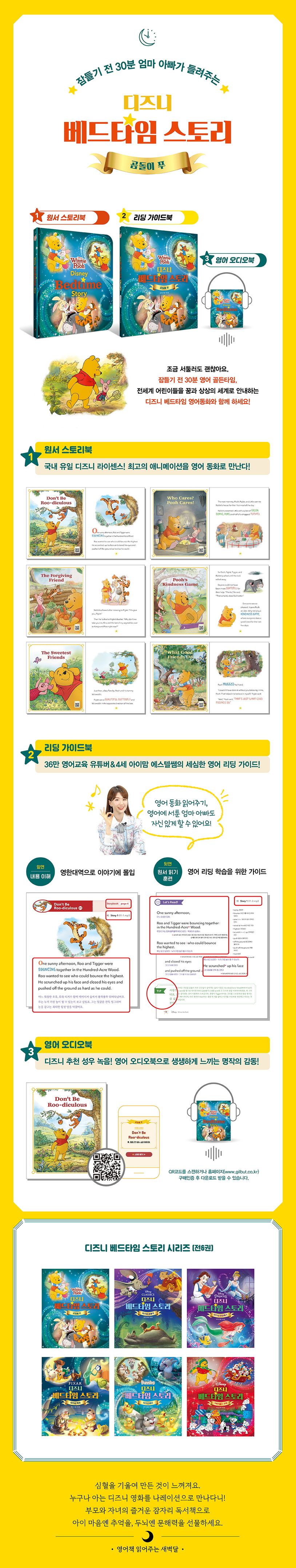 우리 두뇌는 잠들기 30분 전의 기억을 가장 강력하게 기억한다. 그래서 베갯머리 독서는 부모와의 애정 어린 유대감, 편안한 잠자리와 함께 아이의 언어 발달과 기억력 향상에 결정적 역할을 하게 된다. 잠들기 전 30분 영어 인풋 골든타임, 전 세계 어린이들을 꿈과 상상의 세계로 안내하는 디즈니 베드타임 영어 동화와 함께 해보자. 디즈니 베드타임 스토리 시리즈는 〈곰돌이 푸〉, 〈디즈니 클래식〉, 〈디즈니 프린세스〉, 〈디즈니 픽사〉, 〈디즈니 버니〉, 〈크리스마스 선물〉 이렇게 6권이 출간되었다.