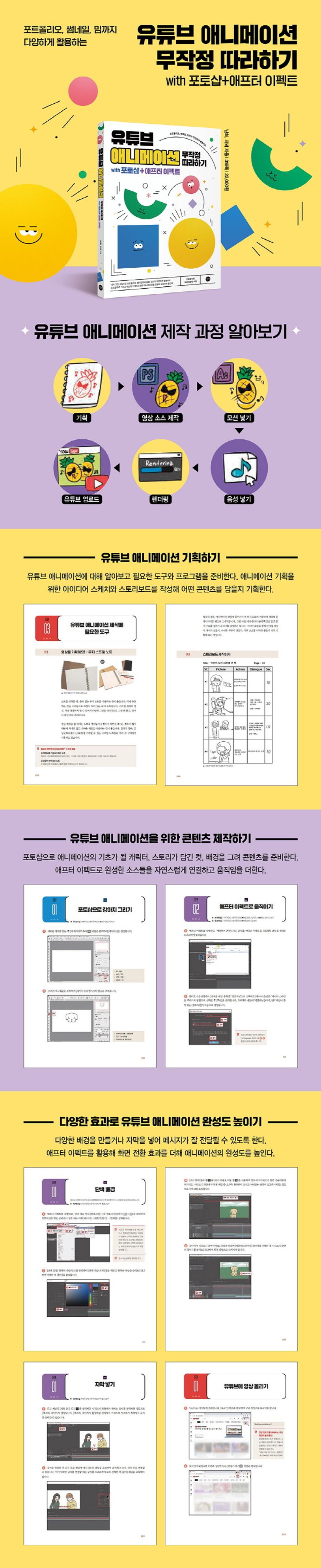 〈유튜브 애니메이션 무작정 따라하기〉에서는 포토샵으로 다양한 캐릭터를 만들어 나만의 그림을 그리고 애프터 이펙트로 움직임을 더해 짧은 애니메이션을 만들 수 있는 예제를 담고 있다. 애니메이션을 더욱 풍부하게 해주는 배경, 자막, 더빙 등의 효과를 익히고, 화면 전환과 같이 움직임에 완성도를 높일 수 있는 기능을 배워 유튜브 애니메이션을 완성해보자!