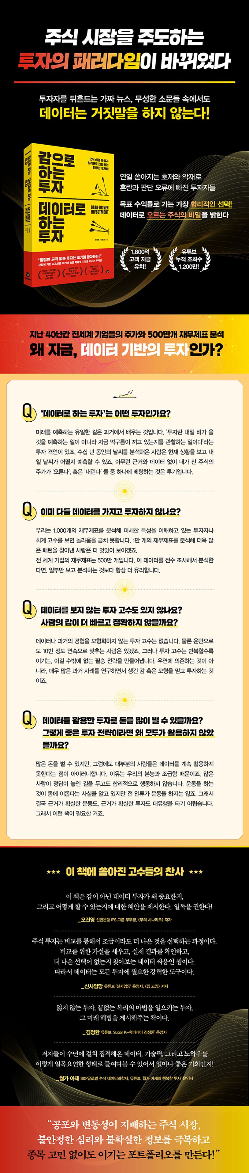 데이터를 사용하지 않는 투자 고수도 많다고 반문할 수 있다. 그들은 투자에 성공하기 위해 수없는 실패를 경험하며 오늘에 이른 사람들이다. 그들의 경험과 전략들을 나의 투자의 가설로 삼고, 그 가설이 시장에서 어떻게 작동하는지 확인할 수 있다면 매우 높은 확률로 투자에 성공할 수 있을 것이다.