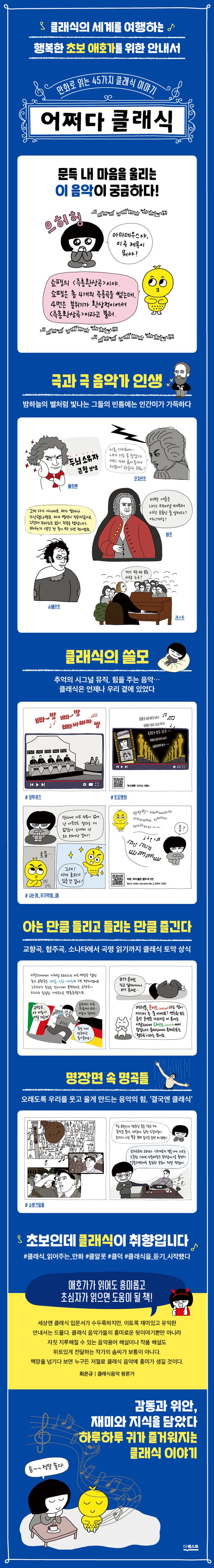 《어쩌다 클래식》은 ‘클래식 읽어주는 만화’다. 즐거운 클래식 초보 애호가인 잼잼이가 AI스피커 아마데우스와 함께 별처럼 빛나는 클래식 음악가들의 숨은 뒷이야기, 클래식 음악을 들을 때면 궁금했던 것들, 그리고 추억의 결정적 장면 너머로 들려오던 음악 이야기 등 45가지 클래식 이야기를 만화로 풀어낸다. 지금은 초보지만 클래식이 취향이며, 앞으로 행복한 애호가가 될 사람들을 위하여.