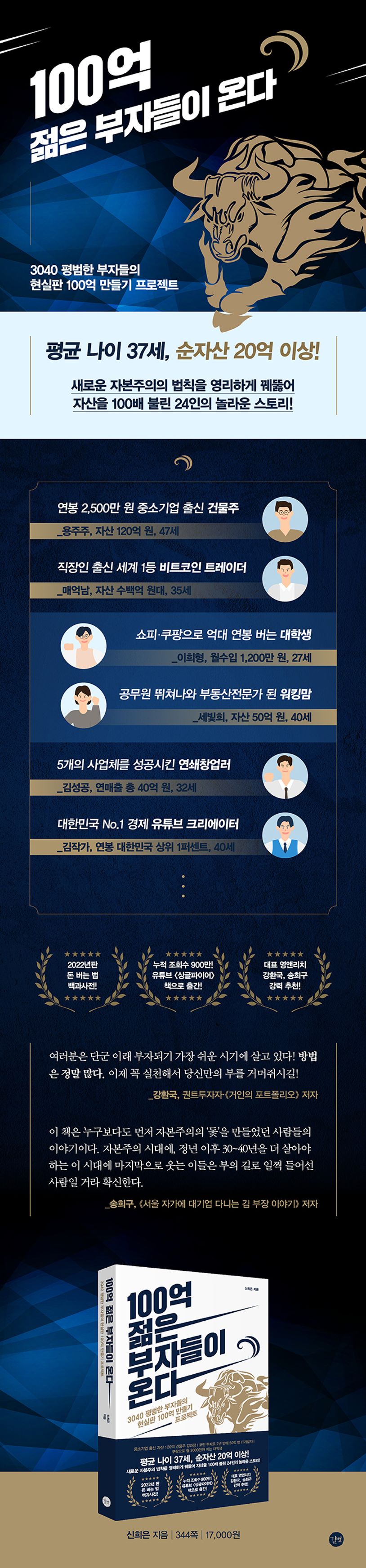 평범한 우리들의 시작은 모두 똑같다. 꼬박꼬박 월급 주는 회사에 기대어 살다가 약 40대 초반쯤 회의감이 들어 자유로운 삶을 꿈꾼다. 상상 속에서는 건물주도 되고, 주식 대박도 나고, 로또 당첨도 되지만 이를 현실로 만드는 사람은 많지 않다. 그러나 어떤 사람들은 특별한 능력이 없더라도 지금보다 더 나은 삶을 살기 위해 뭐라도 하나씩 해본다. 이들은 새벽에 일찍 일어나서 부동산 공부를 하기도 하고, 부자들의 공통점을 연구하기도 하고, 유튜브와 논문 등을 살펴보며 주식투자 대가의 방법을 따라 하기도 한다. 이러한 노력들이 모여 결국에는 원하는 인생을 살게 된다. 《100억 젊은 부자들이 온다》는 24인의 평범한 젊은 부자들에 관한 이야기다. 연봉 2,500만 원만 받던 중소기업 출신 건물주, 쇼피·쿠팡으로 월 3,000만 원 버는 대학생, 코인으로 2년 만에 50억 번 IT 개발자 등 이들의 출신과 돈을 번 방법은 각양각색이지만 한 가지는 동일했다. 팬데믹 이후 새롭게 재편된 자본주의의 법칙을 정확히 꿰뚫어 기회를 포착했다는 것이다.