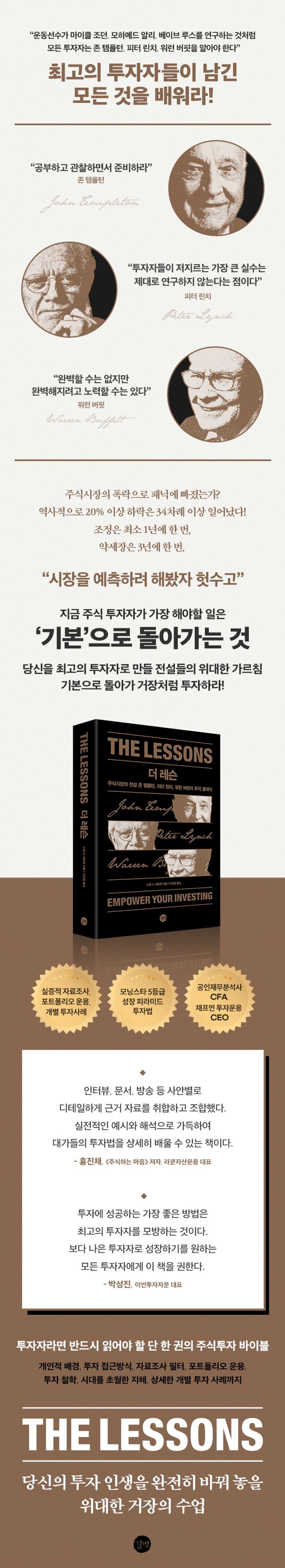 누구나 투자를 한번 시작한 이상 큰 수익을 내고 성공하고 싶은 간절한 마음을 갖는다. 그러나 전쟁과 같은 시장에서 뚜렷한 성공을 거두기는 여간 어려운 일이다. 평범한 대다수 투자자 홀로 주식시장으로부터 교훈을 얻으려면 상당한 시간이 필요하고, 때때로 시장에 비싼 수업료를 내야 할지 모른다. 우리가 어린 시절 운동을 할 때를 되돌아보면, 종종 스포츠 스타의 행동을 따라 하는 경우가 있다. 마이클 조던의 슛이나 리오넬 메시의 드리블을 애써 흉내 내며 실력을 키우려고 노력하는 것들이다. 운동 영웅들의 습관과 기술을 연구하고 모방하는 것이 당연하듯, 투자자들도 이미 성공을 증명한 대가들로부터 값진 배움을 얻는다면 성공적인 투자자로 거듭나는 지름길이 될 것이다. 《더 레슨》은 주식투자의 전설로 불리는 존 템플턴, 피터 린치, 워런 버핏의 귀중한 수업이 담겨 있다. 그들이 성공을 거둔 시대적 상황과 내적 동기, 의사결정 과정, 투자에 관한 철학, 포트폴리오 구성, 투자의 방법과 원칙, 실제 투자 사례, 삶에 대한 지혜를 전설들이 직접 발화한 것을 토대로 연구, 집대성했다. 특히 거장들의 투자법을 복잡하고 어려운 수학 공식이 아닌 완벽히 상식적이고 비즈니스 원칙에 따라 설명해 누구나 쉽게 이해한다. 특히 실제 투자 사례 분석을 통해 전설들의 ‘투자 사고 흐름’을 간접적으로 체험하는 경험은 축복이라 할 만큼 소중하다. CFA이며 자산운용사 CEO인 저자는 책의 말미에 모닝스타 5성 등급 펀드로 거듭나게 한 투자법을 실어 두었다. 존 템플턴, 피터 린치, 워런 버핏의 공통점을 연구해 만든 것으로 투자자가 원칙을 세우는 데 큰 도움을 준다. 뉴스와 대중이 위기라 떠들 때, 거장들처럼 시장에 대한 믿을 갖고 열심히 노력해 투자한다면 이 책의 독자들도 성공 투자자로 첫 발걸음을 내디딜 수 있을 것이다. 《더 레슨》은 투자자가 반드시 지녀야 할 덕목을 잘 알려주는 최고의 스승이 될 것이다.