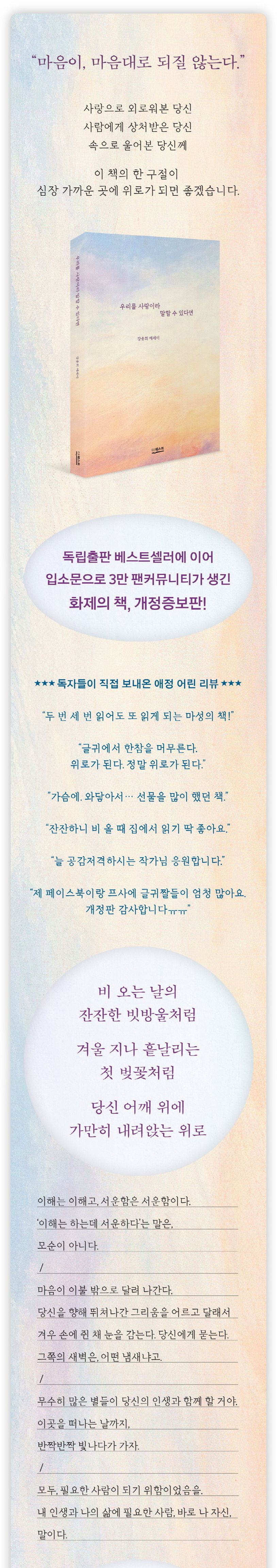 독립출판계에서 폭발적 사랑을 받고 입소문만으로 단행본 재쇄를 거듭한 에세이가 개정증보판으로 새롭게 출간되었다. 도서 《우리를 사랑이라 말할 수 있다면》은 기존 도서 《어느 날 뚜벅이가 걸어왔다, 말을》과 《외로운 것들에 지지 않으려면》에서 글을 추리고 40여 편의 새로운 신작 글을 더해 아름다운 디자인으로 소장가치를 높였다. 여러 번 읽고 곱씹어도 감성이 깊게 배어 나오는 글에 수만 명의 애독자가 지금껏 꾸준한 사랑을 보내와 가능한 일이었다. 5년여의 시간이 흐르며 저자의 더욱더 따스해진 온도를 함뿍 담아, 기존의 독자뿐 아니라 사랑을, 상처를 위로받고 싶은 모든 이들이 기댈 수 있는 한 권이 탄생되었다.
