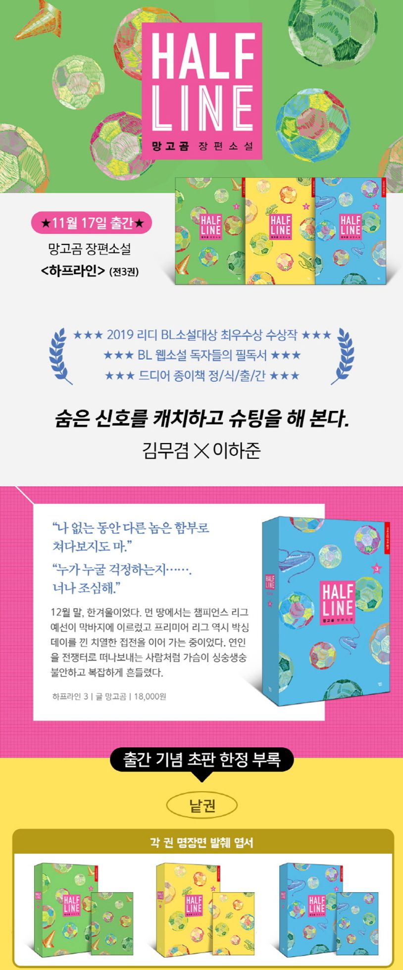 『하프라인』은 망고곰 작가의 BL 웹소설로, 2019년 ‘리디북스 BL소설대상’에서 최우수상을 수상한 인기 작품이다. 작가 특유의 시원시원한 필력을 바탕으로, 스타 축구선수인 김무겸과 신입 피지컬 코치 이하준 두 주인공이 몸부터 가까워져 점차 깊은 유대를 형성해 가는 주요 이야기 전개는 물론, 통통 튀는 주변인물들의 서사까지 흥미롭게 펼쳐져 독자들의 마음을 사로잡고 있다. 이번에 출간한 종이책은 전3권 구성으로, 세트에는 특별 외전이 별책부록으로 함께 구성되어 종이책 출간을 기다린 독자들에게 좋은 선물이 될 것이다.
