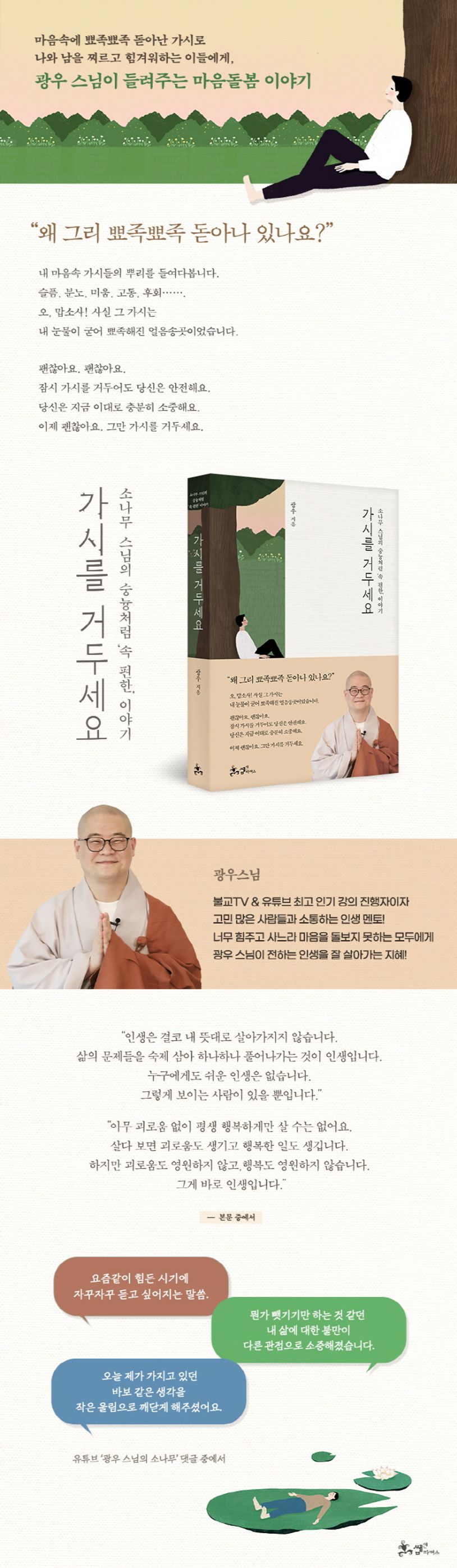 “귀에 쏙쏙 들어오는 재미있는 강의” “요즘같이 힘든 시기에 자꾸자꾸 듣고 싶어지는 말씀” “불안했던 마음이 편안해졌어요” “반복해서 들으며 마음을 다집니다”…. BTN 불교TV 최고 인기 프로그램인 〈광우 스님의 소나무〉 유튜브 영상에 달린 댓글들이다. 시청율 1위, 인기 검색어 1위를 놓치지 않는 ‘소나무 스님’의 명강의는 회를 거듭할수록 뜨거운 반향을 불러일으키며, 불교에 대해 관심 없던 사람들조차 열광하게 만들고 있다. 그런 광우 스님이 종교를 초월해 고민 많은 사람들을 위해 쓴 에세이 《가시를 거두세요》가 출간되었다.