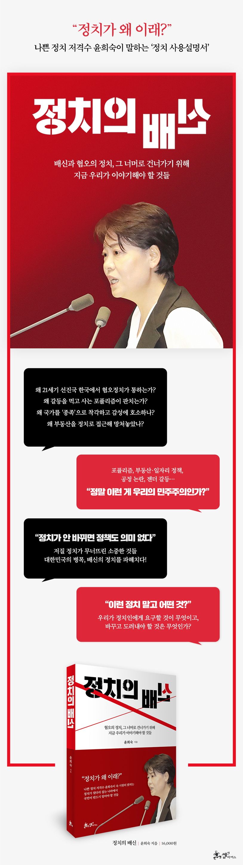 “저는 임차인입니다.” 연설로 전 국민에게 강렬한 인상을 심어주었던 국회의원 윤희숙이 우리 정치의 모순과 비합리, 부조리와 치부를 낱낱이 해체해 ‘국민을 배신하는 정치’의 실체를 밝힌 《정치의 배신》을 출간했다. 그는 대한민국 정책을 날카롭게 분석해온 경제학자로, KDI 교수 시절부터 ‘포퓰리즘 파이터’로 유명했다. 경제학자이자 정책전문가로서 ‘좋은 정책을 만들기 위해’ 정치에 입문했으나 여의도 생활 1년 만에 ‘정치가 안 바뀌면 정책도 의미 없다’는 준엄한 사실을 깨달았고, 뒤틀린 정치에 깜짝 놀라 이 책을 쓰게 되었다고 밝혔다.