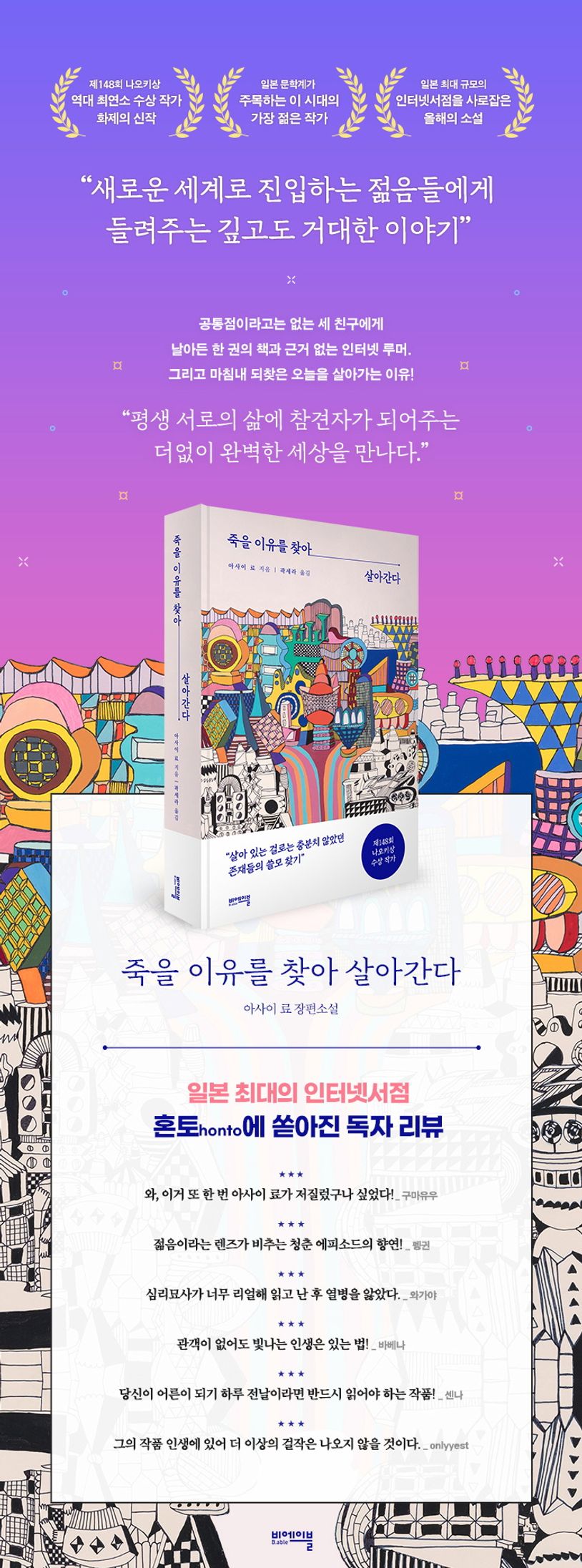 일본을 뜨겁게 달군 나오키상 역대 최연소 수상자이자, 영화 〈키리시마가 동아리활동 그만둔대〉의 원작자로 잘 알려진 소설가 아사이 료. 젊음을 대변하는 아이코닉 작가인 그가 다시 한번 세대를 관통하는 변화구로 독자들의 곁을 찾아왔다. 작품은 주인공의 성장기를 와이드하게 그려내며 어른이라면 누구나 안고 있을 법한 감정의 소용돌이를 다룬다.