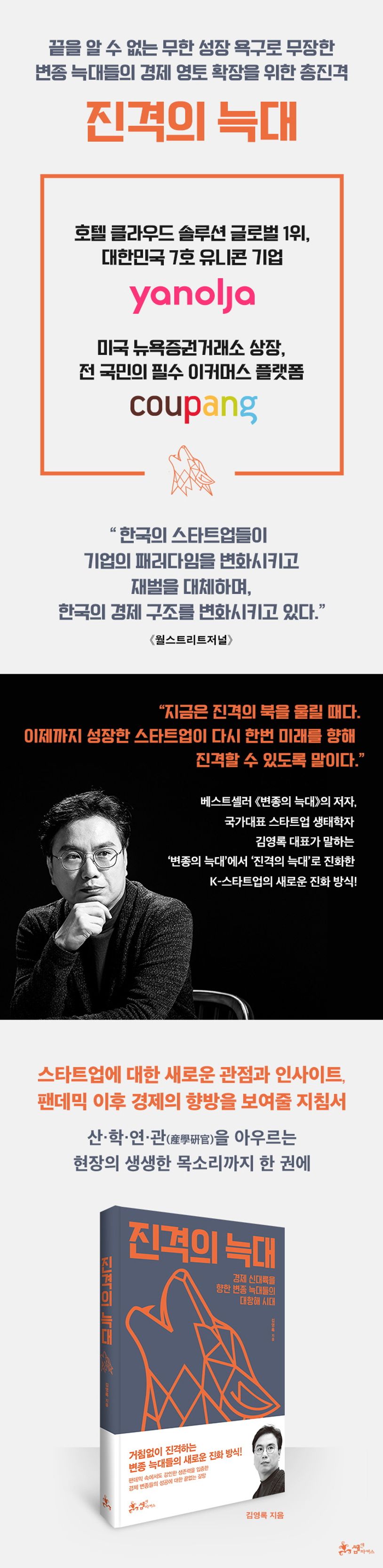 “이제는 진격의 북을 울릴 때다. 이제까지 성장한 스타트업이 다시 한번 미래를 향해 진격할 수 있도록 말이다”라고 강조하는 김영록 넥스트챌린지 대표는 3년 만의 신작, 《진격의 늑대》를 통해 팬데믹 속에서도 강인한 생명력을 입증하며 한국 경제의 패러다임 시프트를 주도하고 있는 변종 늑대, 스타트업의 생태계와 도전, 진화 방식, 미래를 생생하게 보여준다. 촉과 야성으로 무장해 대한민국을 장악한 변종 늑대들은 팬데믹이라는 안개가 걷혔을 때 새로운 경제 영토를 향해 앞서 진격하며 우리가 나아가야 할 방향을 분명하게 보여줄 것이다.