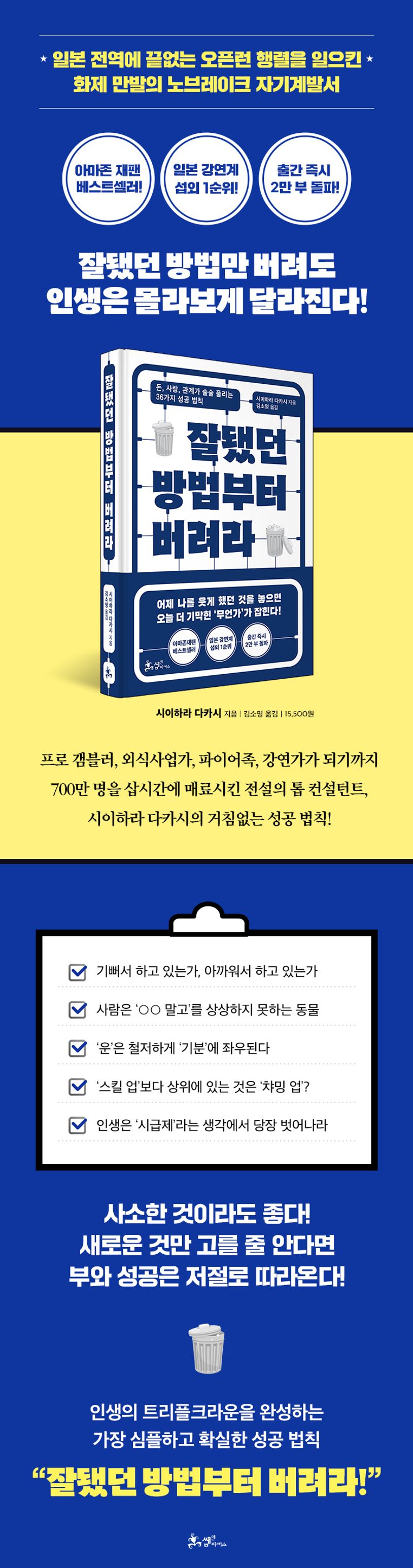 이 책은 일본 전역으로 오픈런 행렬을 몰고 다니는 유명 컨설턴트 시이하라 다카시가 잘됐던 방식을 ‘과감하고 경쾌하게 버리는 법’에 대해 안내하고 있다. 인간은 기본적으로 변화를 싫어하는 동물이다. 따라서 자신을 성공 궤도로 데려다준 방법을 쉽게 놓지 못한다. 그럴수록 다음 무대에서 발목을 잡힐 확률도 높다.