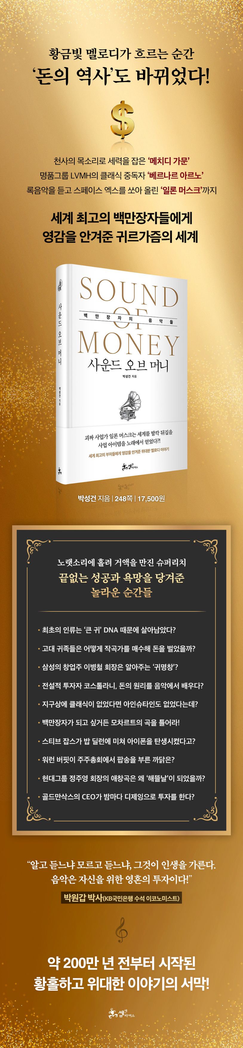 기발한 아이템으로 떼돈을 번 괴짜 사업가 ‘일론 머스크’, 캐시미어를 두른 늑대라 불리는 명품그룹 LVMH의 회장 ‘베르나르 아르노’, 뜨겁게 돈을 사랑한 투자의 귀재 ‘워런 버핏’, 손안의 혁명 아이폰을 탄생시킨 애플의 ‘스티브 잡스’, 현대그룹을 일군 작은 거인 ‘정주영’ 회장 등. 기업가나 투자자로 이름을 날리거나 자기 분야에 성공을 거둔 인물 곁에는 평생 영감을 안겨준 ‘특별한 음악들’이 존재했다. 그리고 놀랍게도 그들은 하나같이 광적인 음악애호가들이었다.