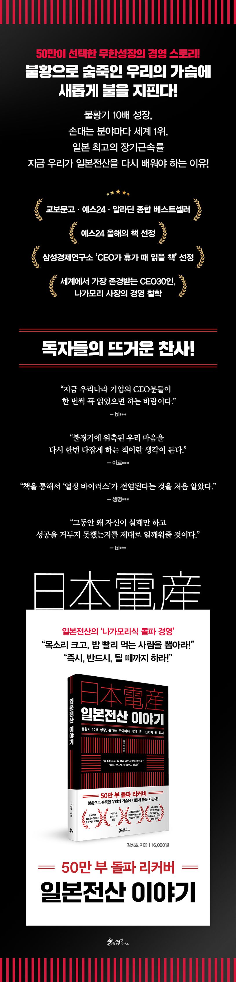 지난 15년 동안 수많은 기업의 경영인들은 물론이고 자기계발에 힘쓰는 사람들에게 큰 공감을 끌어낸 《일본전산 이야기》가 ‘50만 부 돌파 리커버’로 새롭게 출간되었다. 따라가기 힘들 정도로 쉴 새 없이 바뀌는 비즈니스의 세계에서 일본전산과 나가모리 시게노부 회장의 이야기가 15년이 넘는 시간 동안 여전히 신뢰받으며 읽히는 이유는 무엇일까?
