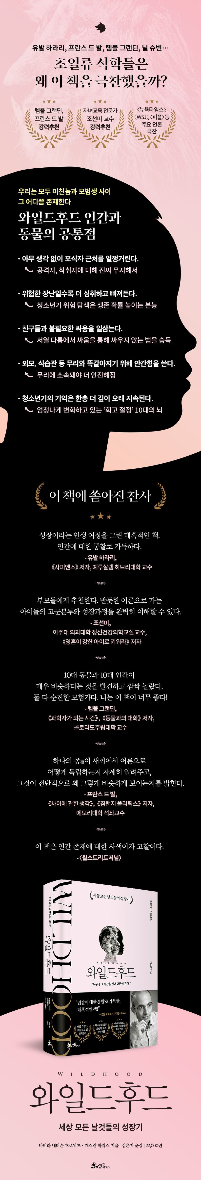 〈뉴욕타임스〉, 〈월스트리트저널〉, 〈피플〉 등 유수 언론은 출간 즉시 이 책을 집중 조명하며, “성장에 관한 야생의 본능을 아름다운 세밀화처럼 포착해낸 명불허전 역작”이라고 평가했다. 이 책에 나오는 청소년 동물의 성장기, 아니 생존기를 보다 보면, 인간의 삶이 더욱 선명하게 만져진다. 청소년 자녀는 물론이고 우리 자신이 잔혹한 ‘와일드후드’를 어떻게 거쳐왔는지, 세상의 모든 ‘새끼’들이 ‘어른’으로 자라는 것이 얼마나 감동적이고 경이로운 사건인지를 새삼 느끼게 해주는 책이다. 세계적인 석학 유발 하라리, 프란스 드 발, 템플 그랜딘, 닐 슈빈 등이 극찬했으며, 대한민국 부모 멘토 아주대 조선미 교수도 추천했다.