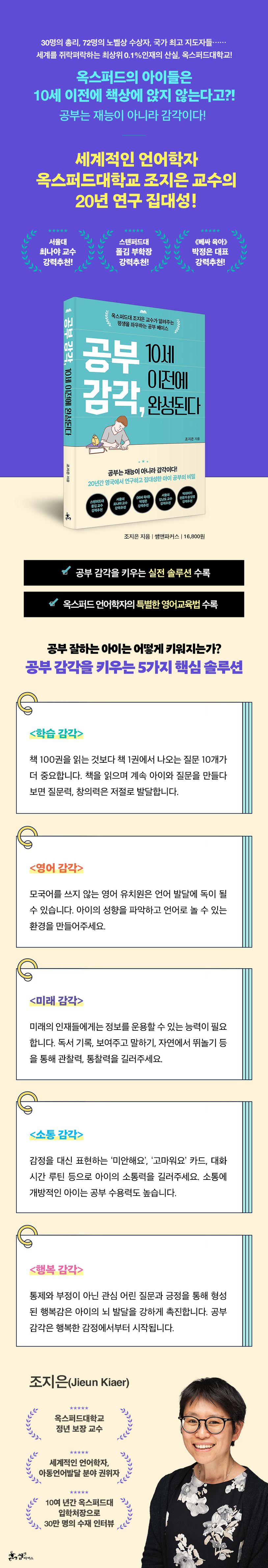 옥스퍼드대학교의 언어학 교수이자 입학처장으로서 수십만 명의 수재를 만난 저자는 스스로 공부하고 탐구하는 아이가 가진 공통된 특성을 발견했다. 조그만 자극으로도 금방 배우고자 했고, 쫓기듯 치열하게 공부하지 않으면서도 커다란 학습적 성취를 이뤄냈다. 무엇보다도 부모를 깊이 신뢰하고 존경했다. 부유하고 교양 있는 가정의 아이들이어서 그랬을까? 저자는 아이가 어릴 때 ‘공부 감각’을 키우면 된다고 말한다. 《공부 감각, 10세 이전에 완성된다》는 다양한 양육 사례와 이론을 통해 쉽고 지속 가능한 방식으로 10세 이후가 안심되는 공부 감각을 아이에게 선물하도록 안내한다. 아이들은 옥스퍼드식 교육의 5가지 핵심 솔루션을 통해 학습 효과를 폭발시키고, 부모의 통제력을 벗어난 미래에도 스스로 삶을 개척해나갈 수 있을 것이다.