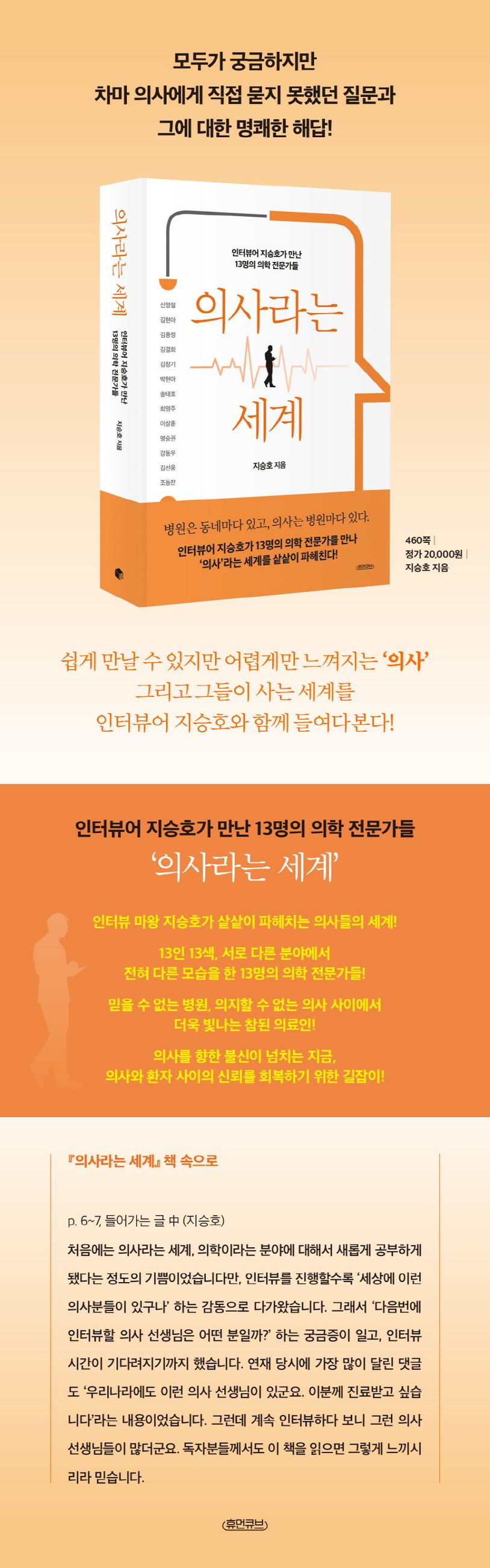 『의사라는세계』는115만구독자를가진〈의학채널비온뒤〉에연재된분야별의사들의인터뷰를엮은책이다.지승호작가는경청과이해의힘으로‘의사’라는세계를샅샅이파헤쳐우리에게소개했다.