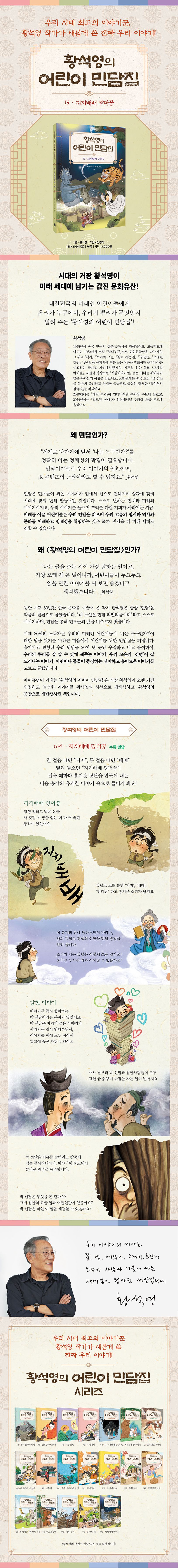 『황석영의 어린이 민담집 19. 지지배배 덩더꿍』에서는 착실하게 살아온 떠꺼머리 머슴이 기묘한 새의 깃털을 가지고 월하노인이 점지해 준 운명과 만나는 이야기가 나온답니다. 또, 민담 속 기묘한 존재들이 모두 등장하는 이야기를 보면 우리 이야기, 우리 민담이 왜 전국 각지로 널리 퍼지게 됐는지도 알 수 있어요.