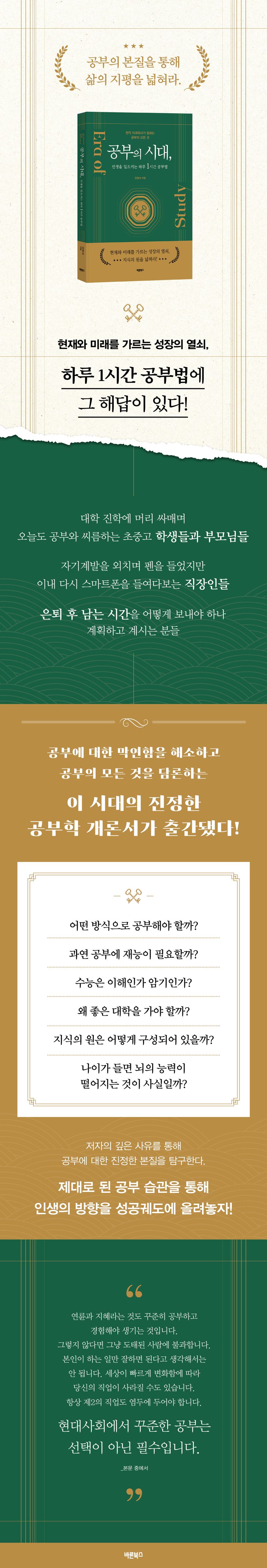 하지만 공부의 속성은 원래 그런 것이 아니다. 여러분은 ‘본인이 스스로 하는 공부’를 해본 적이 있는가? 관심사에 대한 공부, 취미에 대한 공부, 모르는 것에 대한 공부 등등…. 《공부의 시대, 인생을 일으키는 하루 1시간 공부법》은 잃어버린 공부에 대한 흥미와 취미를 다시 불러일으키고, ‘하루 1시간 공부, 하루 1시간 운동’ 습관을 강력하게 추천하고 있다. 더불어 공부의 본질적인 의미를 탐구하며, 경쟁사회에서 오염된 공부의 진정한 가치를 건져 올린다. 공부는 단기적인 수단이 아니다. 인생을 일으킬 장기적인 ‘목표’다. 인생의 성공 궤도를 찾는 법, 그 종착지를 거머쥐기 위해 다시 펜을 들어야 한다.