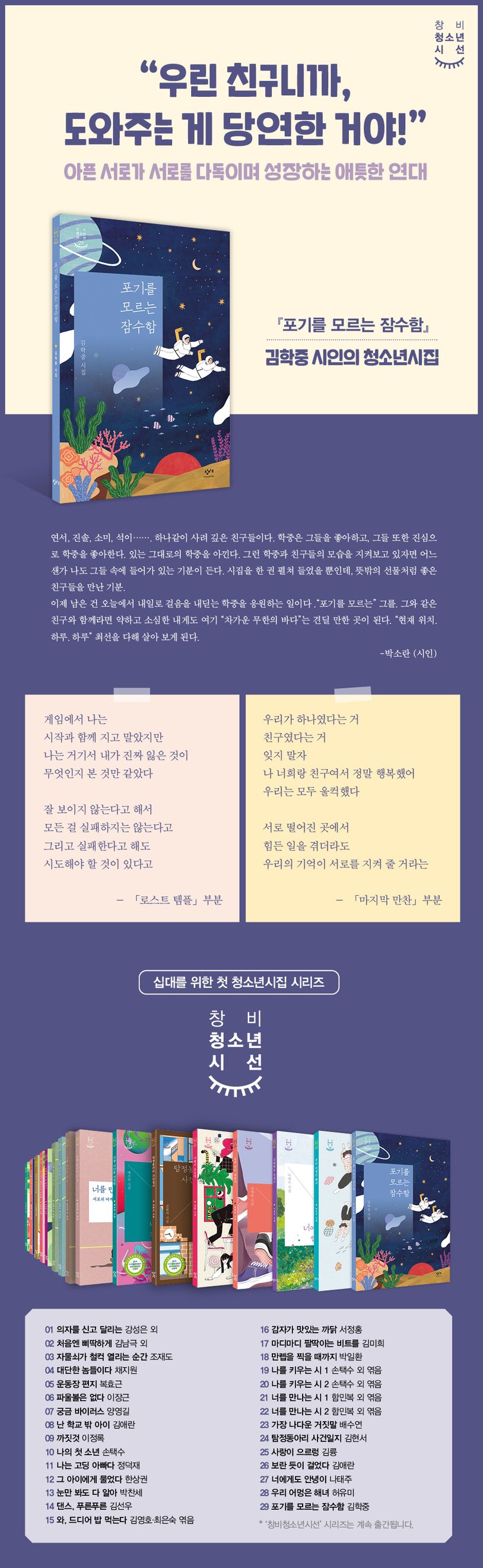 ‘창비청소년시선’의 스물아홉 번째 권으로 김학중 시인의 『포기를 모르는 잠수함』이 출간되었다. 2009년 〈문학사상〉을 통해 등단한 이래, 2017년 박인환 문학상을 수상하고 시집 ?창세?를 펴낸 김학중 시인의 첫 청소년시집이다. 시인의 청소년 시절을 짐작케 하는 사건들이 가족과 친구들 간의 에피소드를 통해 서술되어 있다. 어려움을 묵묵히 받아들이되, 부당함에 또렷하게 저항하는 인물들의 모습이 ‘흙 아래로 무성히 뿌리내리는 생명력을 지녔다’는 평을 들은 시인 특유의 문체로 쓰였다. 박소란 시인의 해설과 함께 읽으면 더욱 선명하게 즐길 수 있는 이 시집은 ‘ 서울문화재단 잠실창작스튜디오의 장애인 예술 창작 활성화 지원 사업 선정작이다.