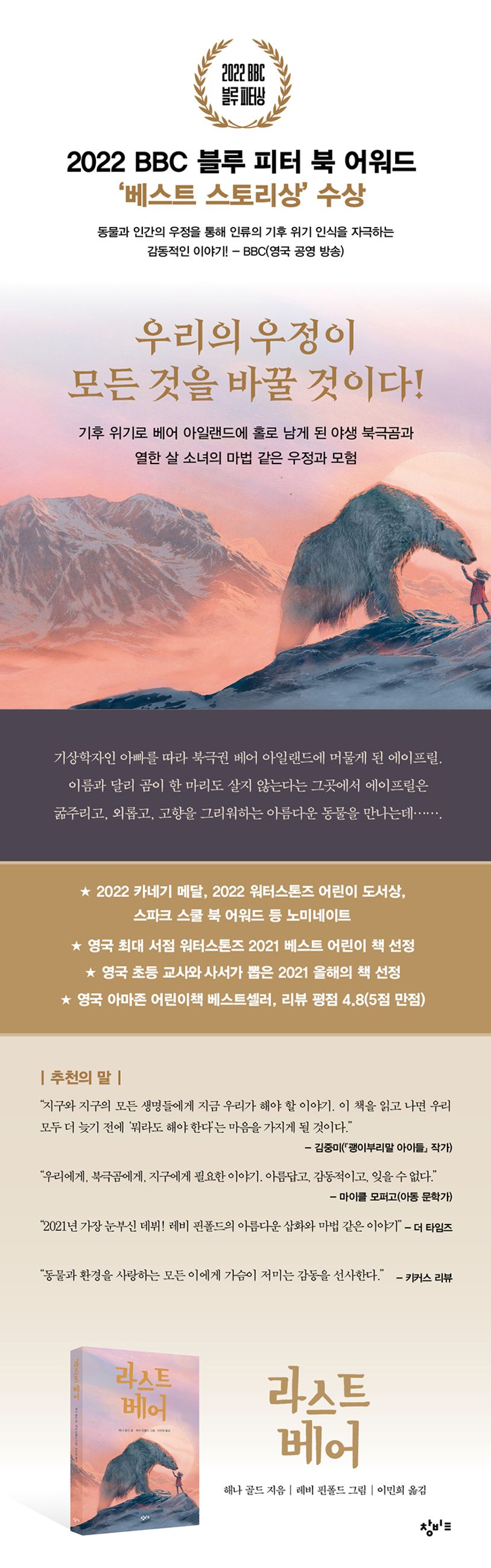 『라스트 베어』는 기상학자인 아빠를 따라 북극권 베어 아일랜드에 머물게 된 에이프릴과 고향을 그리워하는 야생 북극곰의 우정과 모험을 그린 장편 동화다. 데뷔작이라고 믿기 어려운 해나 골드의 매혹적인 이야기와 케이트 그리너웨이상 수상 작가인 레비 핀폴드의 아름다운 삽화가 야생 북극곰과 열한 살 소녀의 우정과 모험이라는 마법 같은 사건을 생생하게 펼쳐 낸다.