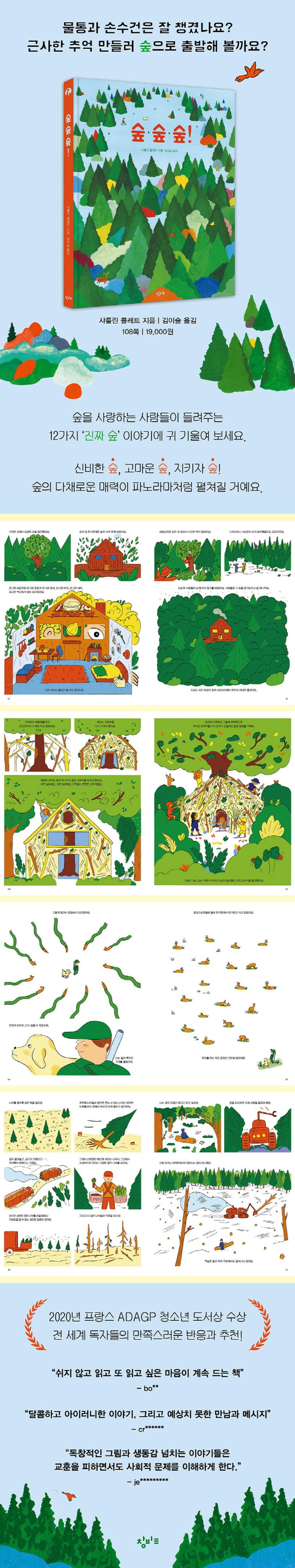 《숲숲숲!》은 2020년 ADAGP 프랑스 청소년 도서상을 수상했으며, 이탈리아어 등 다른 언어로도 번역되어 출간되었다. 더불어 5~6쪽 정도의 짤막한 에피소드에 메시지와 서사가 알차게 들어 있어 얇은 그림책에서 글이 많은 책으로 넘어가는 어린이들에게 도움이 될 책이다.
