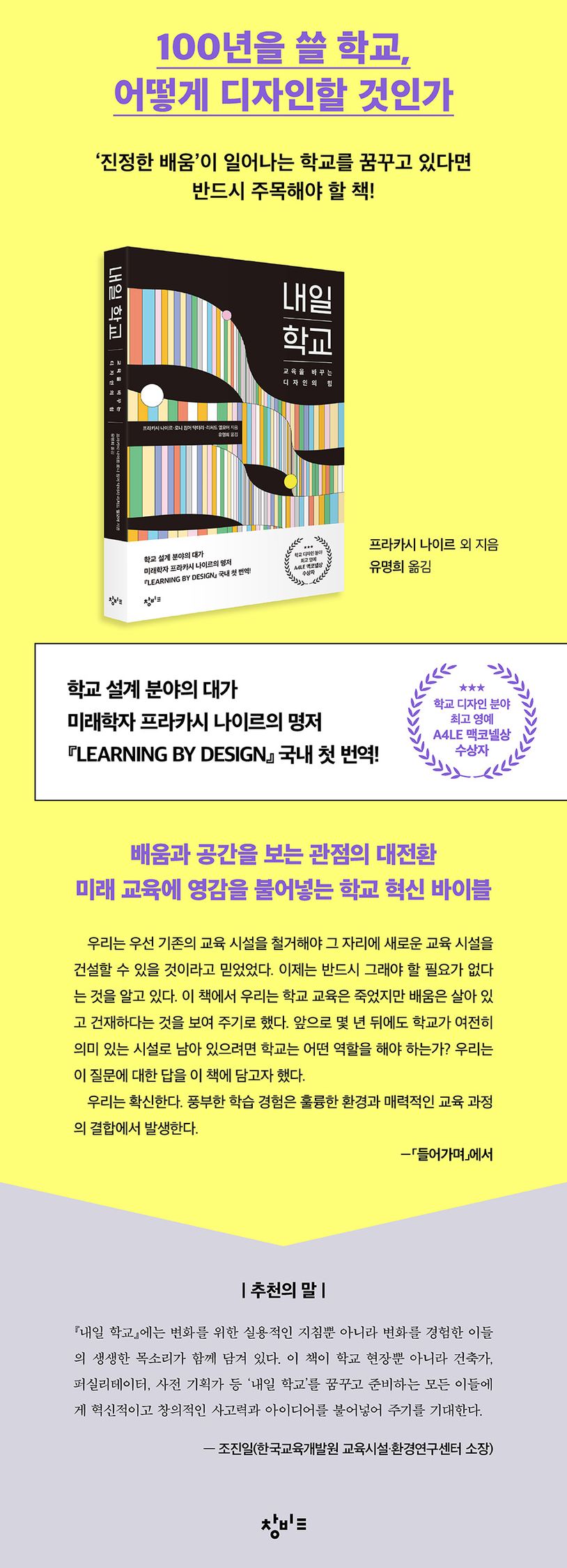 학교 설계 분야에서 변혁을 주도하는 글로벌 리더 중 한 명인 프라카시 나이르의 책이 국내에 처음으로 소개된다. 『내일 학교』(LEARNING BY DESIGN)는 미래 학자이자 선구적인 건축가인 프라카시 나이르와 건축가 로니 짐머 닥터리, 교육 전문가인 하버드대학교 교수 리처드 엘모어가 공동 저자로 참여한 책으로, 학교가 진정한 배움을 실천하는 장소가 될 수 있게 돕는 ‘변화의 로드맵’이다.