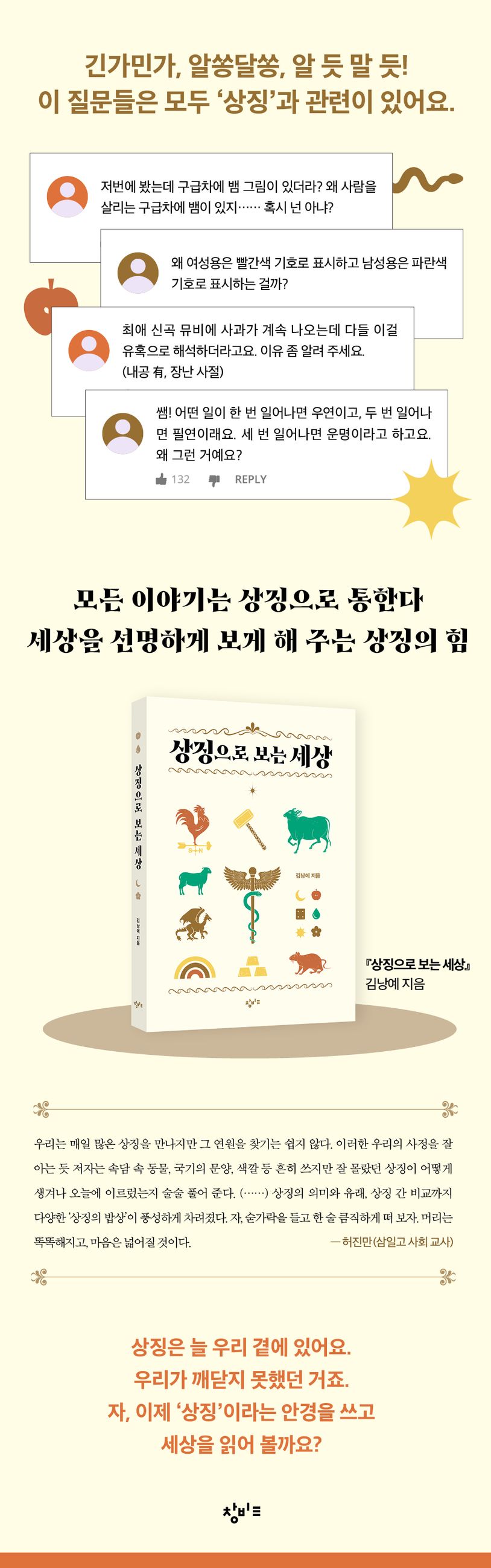 흔히 접하는 사물에 담긴 상징 이야기를 쉽게 풀어 낸 청소년 교양서 『상징으로 보는 세상』이 출간되었다. 이 책은 동식물을 비롯한 자연과 숫자, 색깔, 생활용품 등 우리를 둘러싼 일상 속 31가지 대상이 상징하는 바를 다룬다. 왜 그리고 어쩌다 이런 상징이 생겼는지, 상징에 어떤 의미가 있는지, 어떤 상징이 같고 다른지, 분야별로 가장 대표적인 상징은 무엇인지 살피다 보면 우리 전통문화는 물론 다양한 종교와 신화, 철학과 세계사까지 자연스럽게 익힐 수 있다. 다정하게 말을 건네는 저자와 게임, 영화 등의 익숙한 예시는 삼라만상에 “왜요?”를 던지는 청소년 독자를 ‘걸어 다니는 잡학 사전’으로 만들어 줄 것이다.