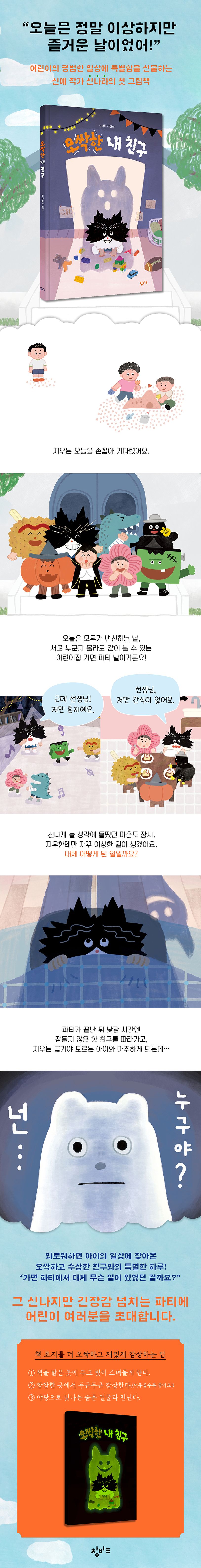 『오싹한 내 친구』(신나라 그림책)는 외로워하는 아이 앞에 미지의 존재를 등장시켜 긴장감과 공포감을 촉발해 재미를 극대화하면서도, 또래와 놀고 싶은 아이의 마음을 보듬어 애틋한 감동을 자아내는 독특한 그림책이다. 전학 간 어린이집에 적응 못 한 아이가 정체 모를 존재와 상황이 유발한 비일상성 덕에 친구들과 더 교류하며 적응하는 이야기로, 유아기 특유의 소속의 욕구, 변신의 욕구, 세계에 대한 호기심이 서사 진행의 동력이 되어 깊은 공감과 위안을 선사한다.
