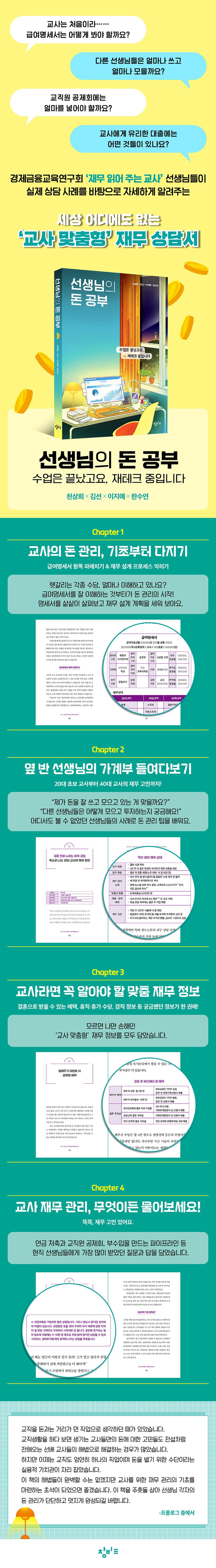 『선생님의 돈 공부 - 수업은 끝났고요, 재테크 중입니다』는 경제금융교육연구회 소속 천상희, 김선, 이지예, 한수연 4명의 현직 교사들이 함께 썼다. 저자들은 지난 3년간 ‘재무 읽어 주는 교사’ 소모임을 통해 동료 교사들을 대상으로 상담과 연수를 진행하면서 돈 관리의 필요성을 느끼는 교사들이 많다는 것을 깨달았다. 특히 불확실한 금융 상황과 높은 부동산 가격, 불안정한 공무원 연금에 따른 노후 걱정 탓에 젊은 선생님들의 관심이 뜨거웠다. 이와 동시에 교직의 특수성을 고려한 재무 상담은 부족한 현실도 함께 실감했다. 이러한 아쉬움을 극복하고자 저자들은 교사라는 직업의 특수성을 고려하면서도 개개인의 삶의 가치와 습관에 적합한 재무 설계 방법을 연구하기 시작했다. 그 고민과 실천의 결과가 바로 이 책이다.