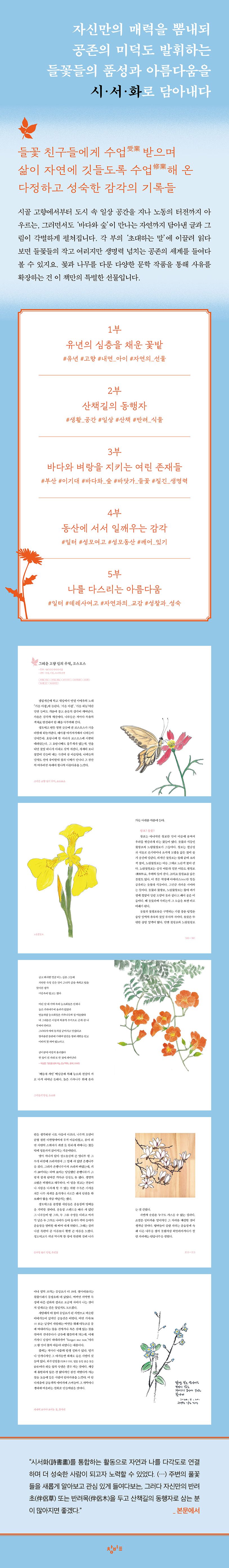 산과 들을 끼고 살던 아이가 바닷가로 이사 와 그곳의 자연에 스며들며 자라고 문학에 심취해 국어 교사가 되어 교정의 들꽃들과 학생들을 보살피며 더 좋은 어른이 되고자 애써온 저자의 삶은 나름의 서사를 이룬다. 저마다의 개성을 지키며 조화롭게 살아가는 들꽃들로부터 공존과 공감의 지혜를 배우고, 학생들도 그처럼 자기 개성을 펼치면서도 조화롭게 살아가길 바라는 저자는 이렇게 말한다. “들꽃에 대한 관심은 결국 작고 여린 존재들에 대한 애정이며, 주변의 소외된 것들에 대한 응원”이라고. “이들의 존재를 인식하는 것은 자연과 사람을 이해하는 것과 통하며, 주변의 사물과 사람에 대해 애정을 품는 것과도 통한다”고 믿는다는 저자의 다정하고 성숙한 감각은 이러한 통찰로도 이어진다. “학생들과 생활하며 그들을 가르치기도 하지만 또 많이 배우기도 한다. 함께 배우고 함께 성장하는 상호 작용이 곧 수업”이라며, “자연으로부터는 일방적인 배움이라 할 수업(受業)을 받아 왔다. 한편 자신의 일이나 공부를 위해 스스로 갈고닦는 것 또한 수업(修業)이라 할 수 있다. 이렇듯 수업의 의미를 확장하면 결국 인생은 곧 수업”이라 역설한다.